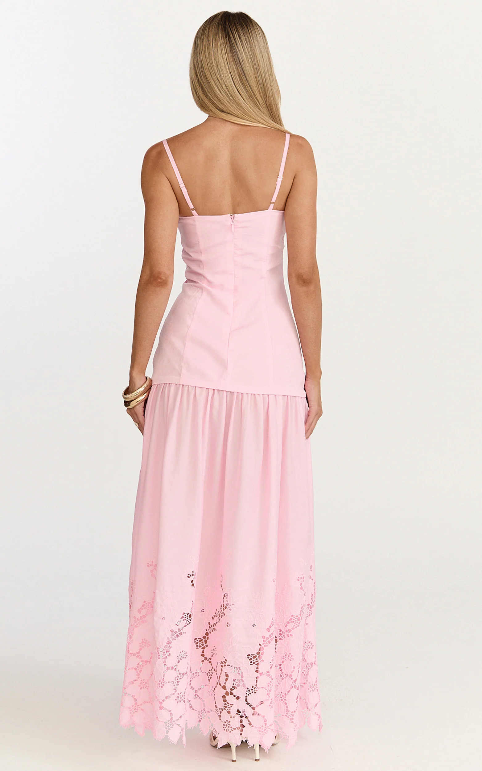 Everly Maxi Dress - Straight Neck Broderie Cut Out Hem Dress in Pink