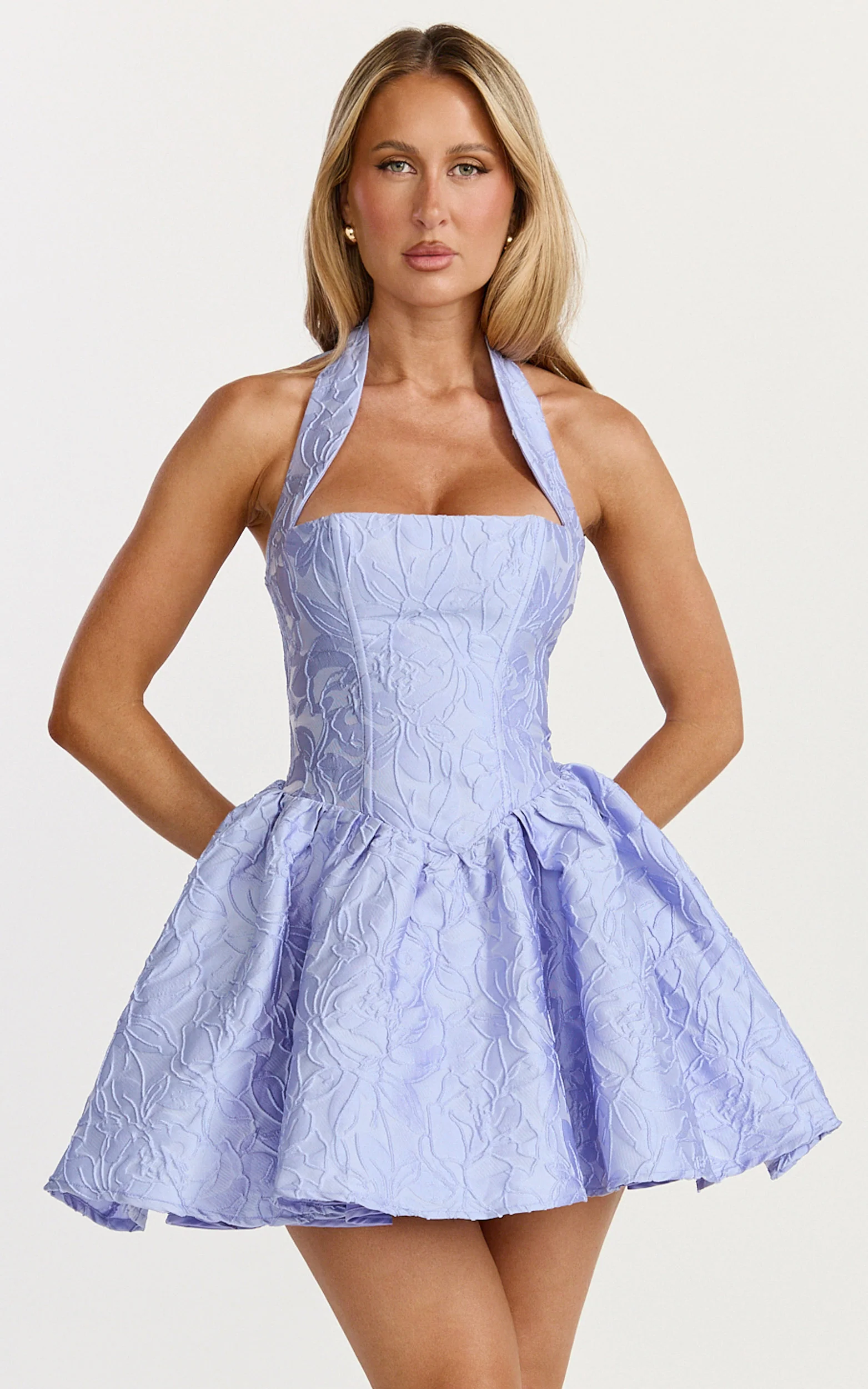 Emme Mini Dress - Strapless Jacquard Placement Floral A Line Dress in Blue