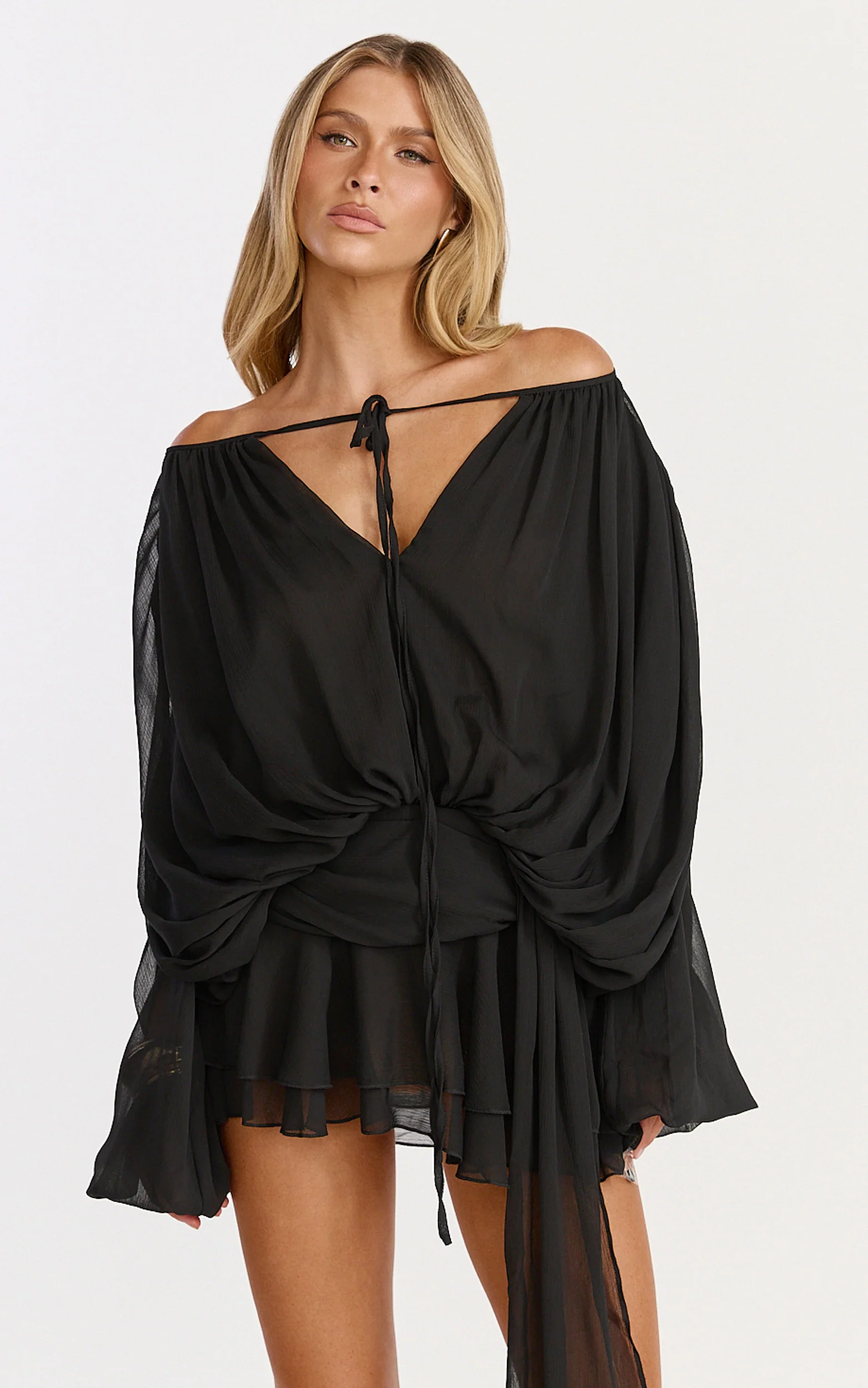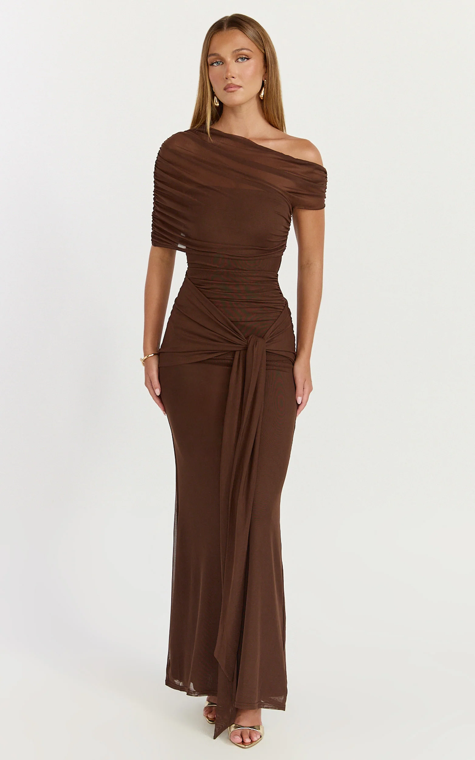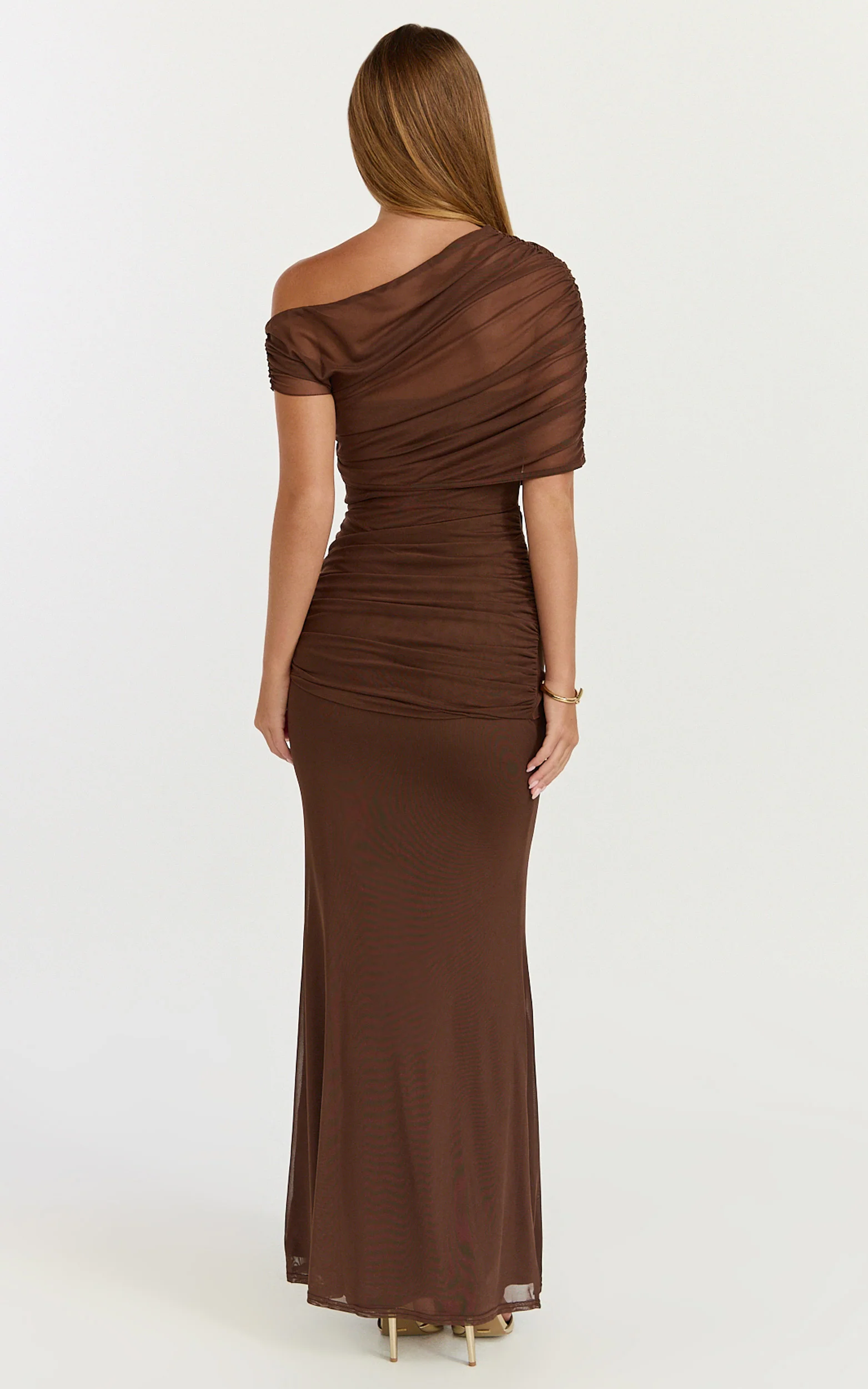 Nicolette Maxi Dress - Cape Sleeve Off Shoulder Dress in Chocolate