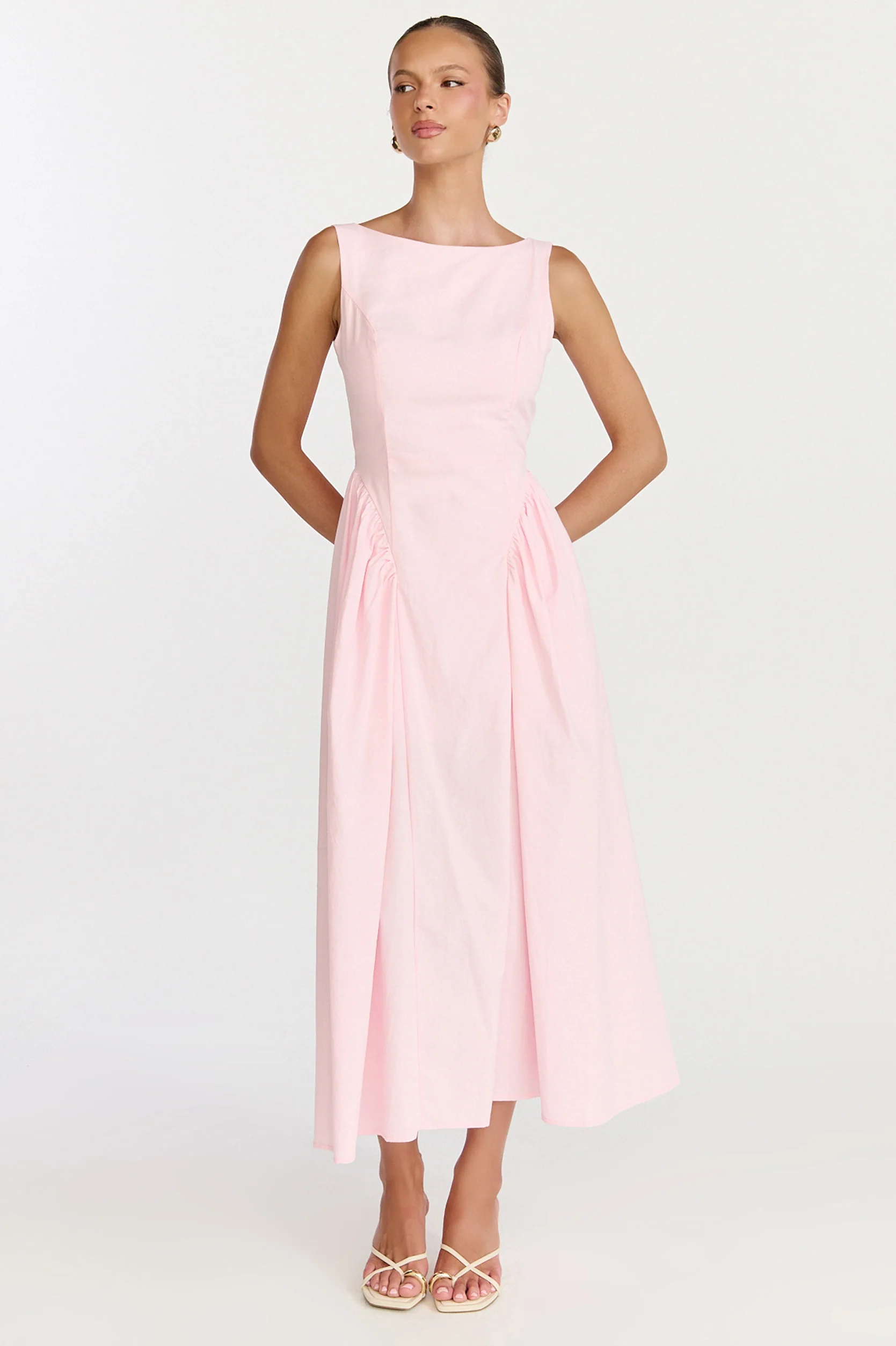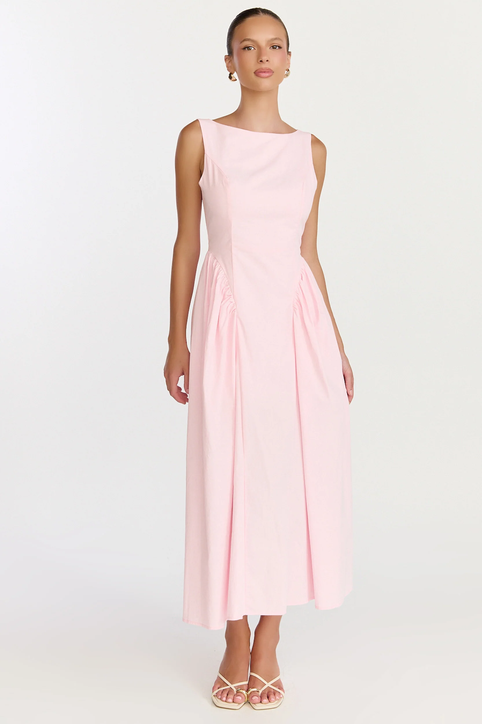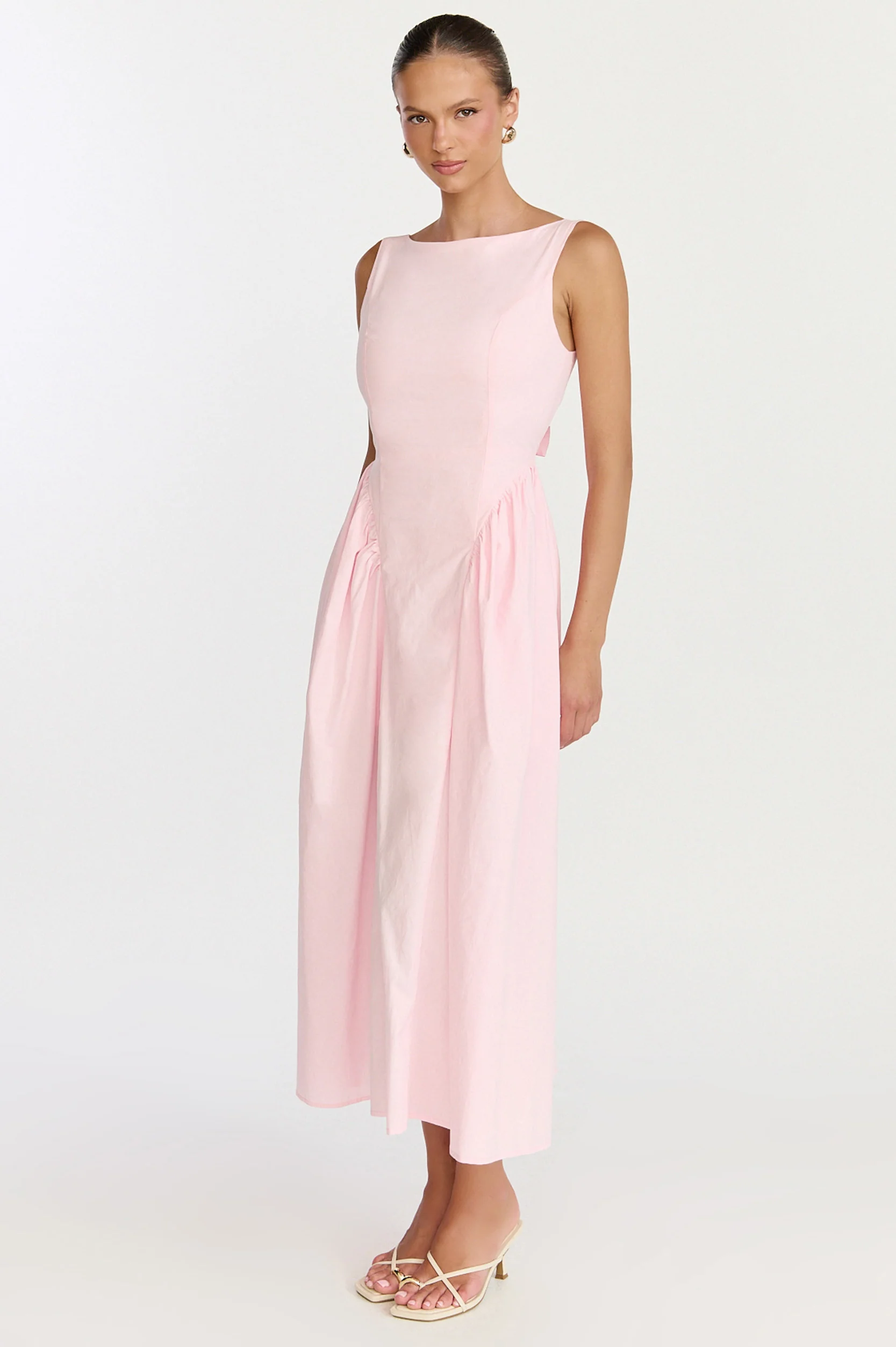 Casina Midi Dress - Boat Neck Tie Back Fit And Flare Dress in Pale Pink