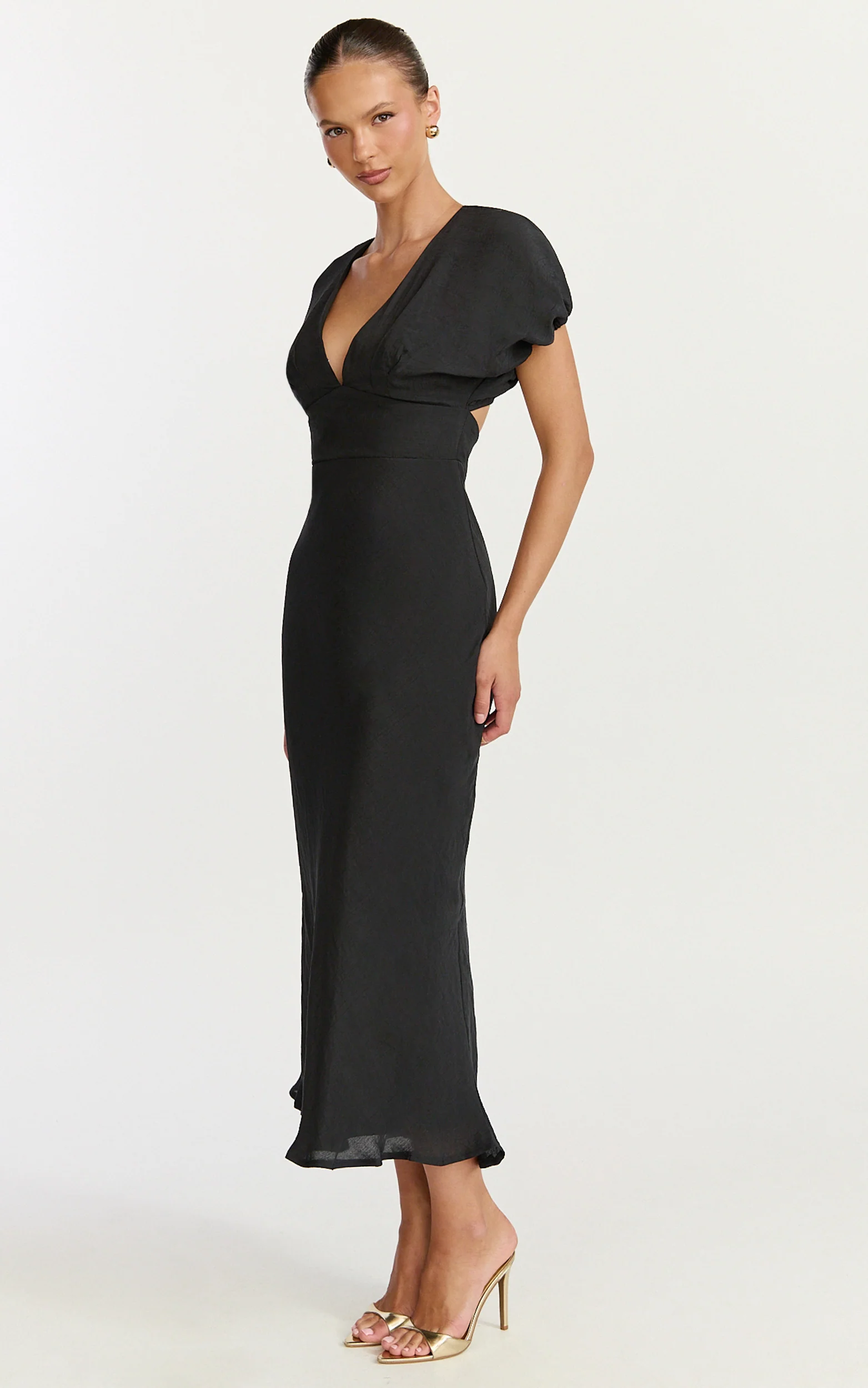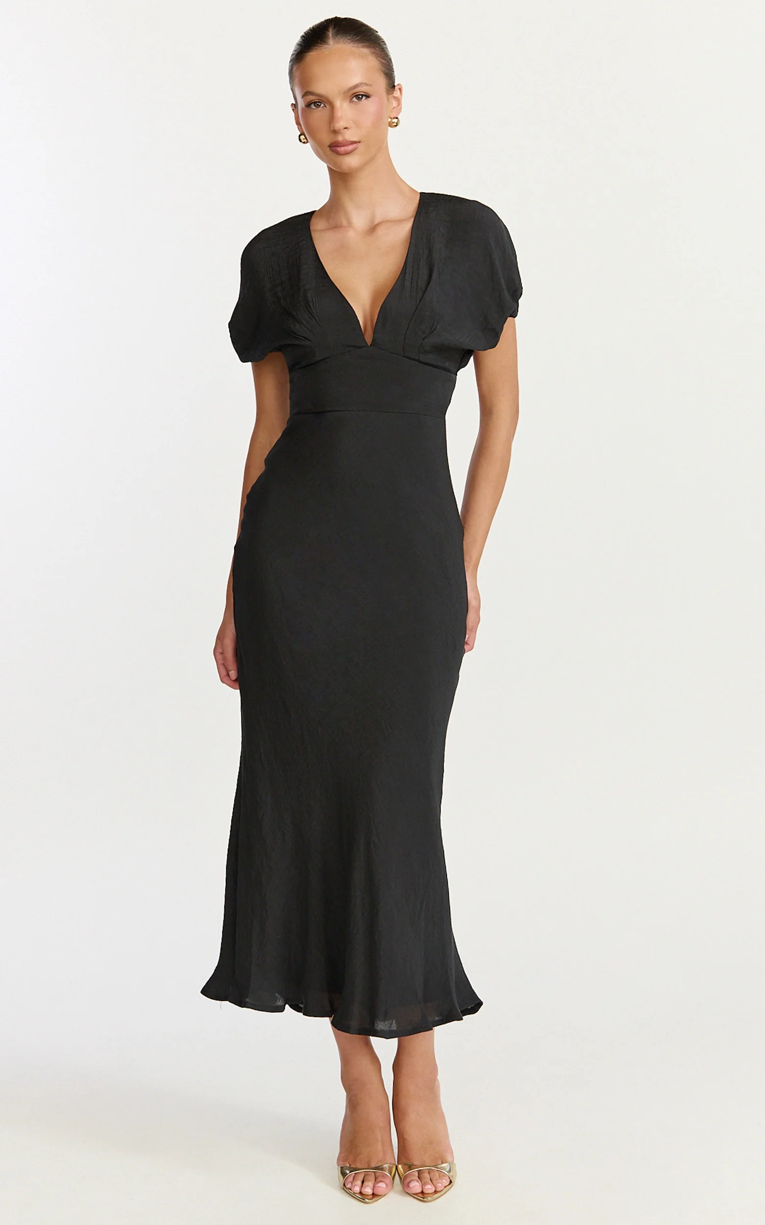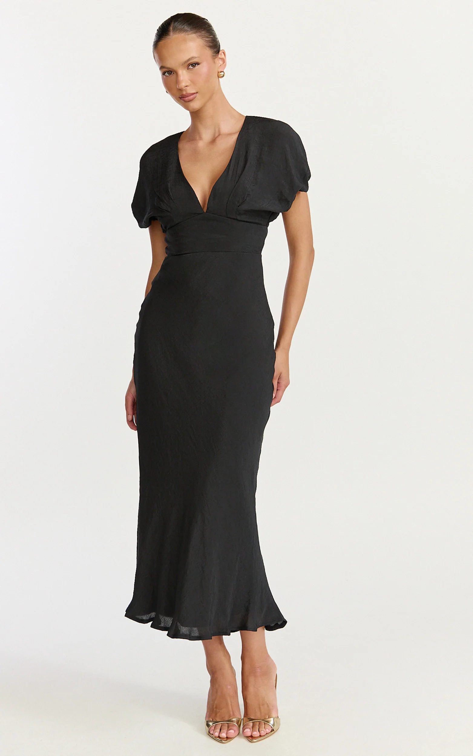 Desiree Midi Dress - V Neck Flutter Short Sleeve Slip Dress in Black