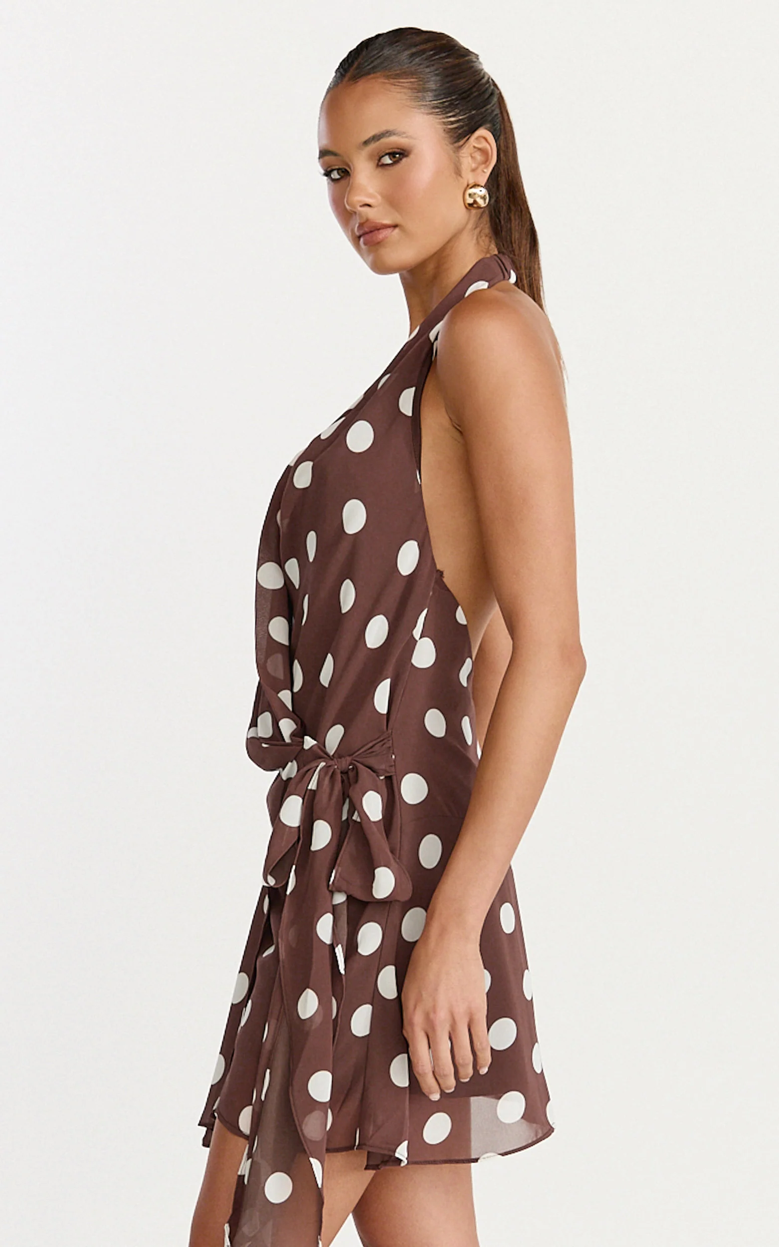 Lia Mini Dress - Wrap Around Dress in Choc Polka Dot