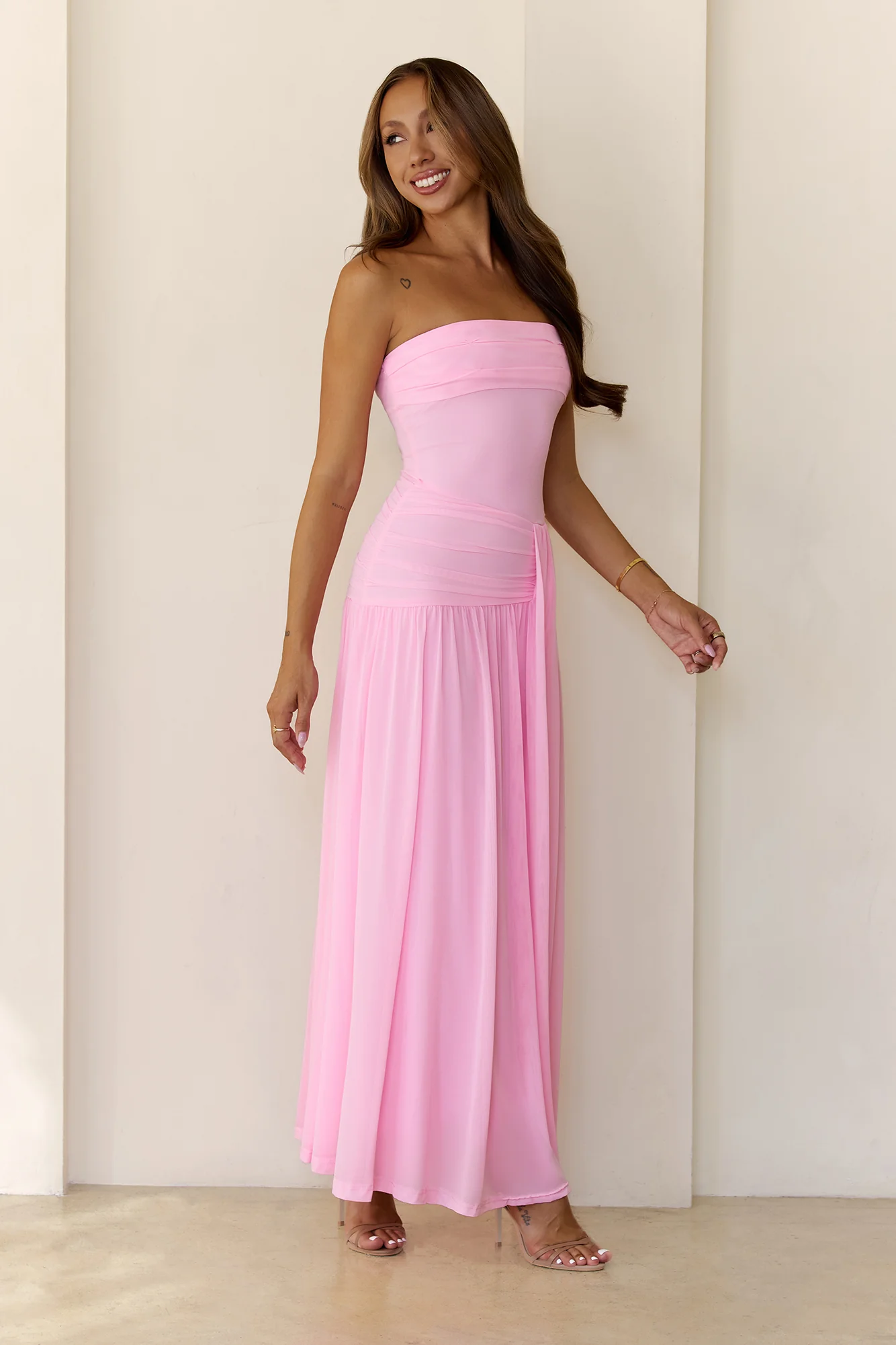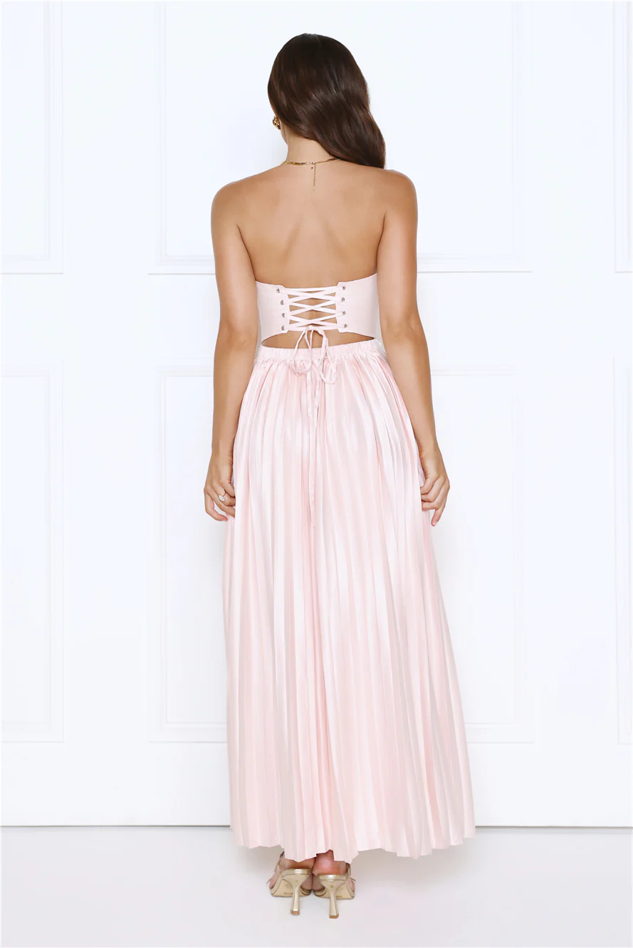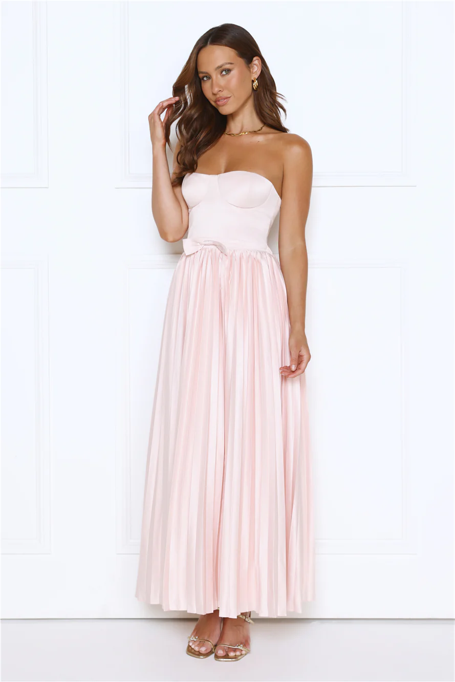Glossed Over Strapless Satin Pleated Maxi Dress Pink