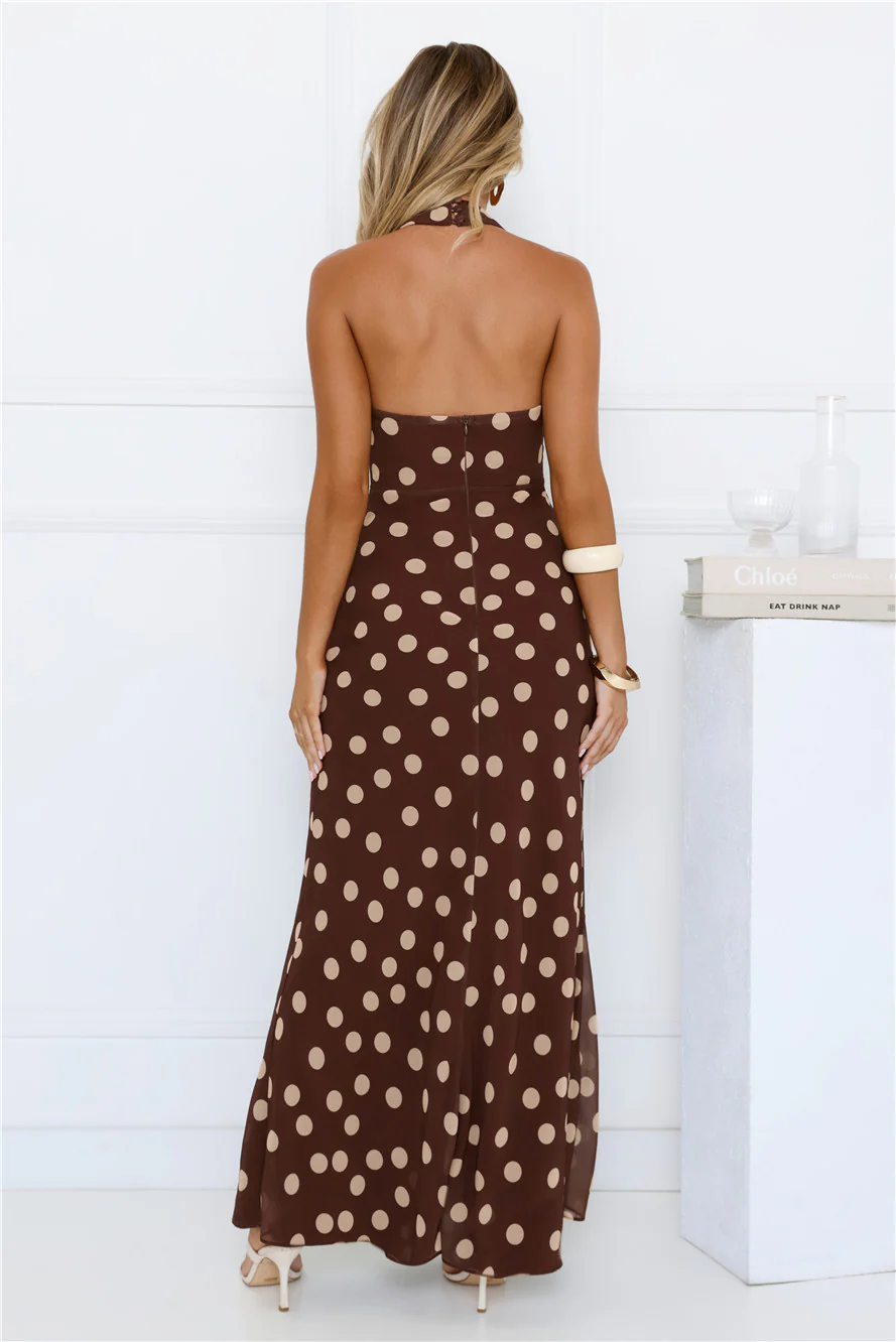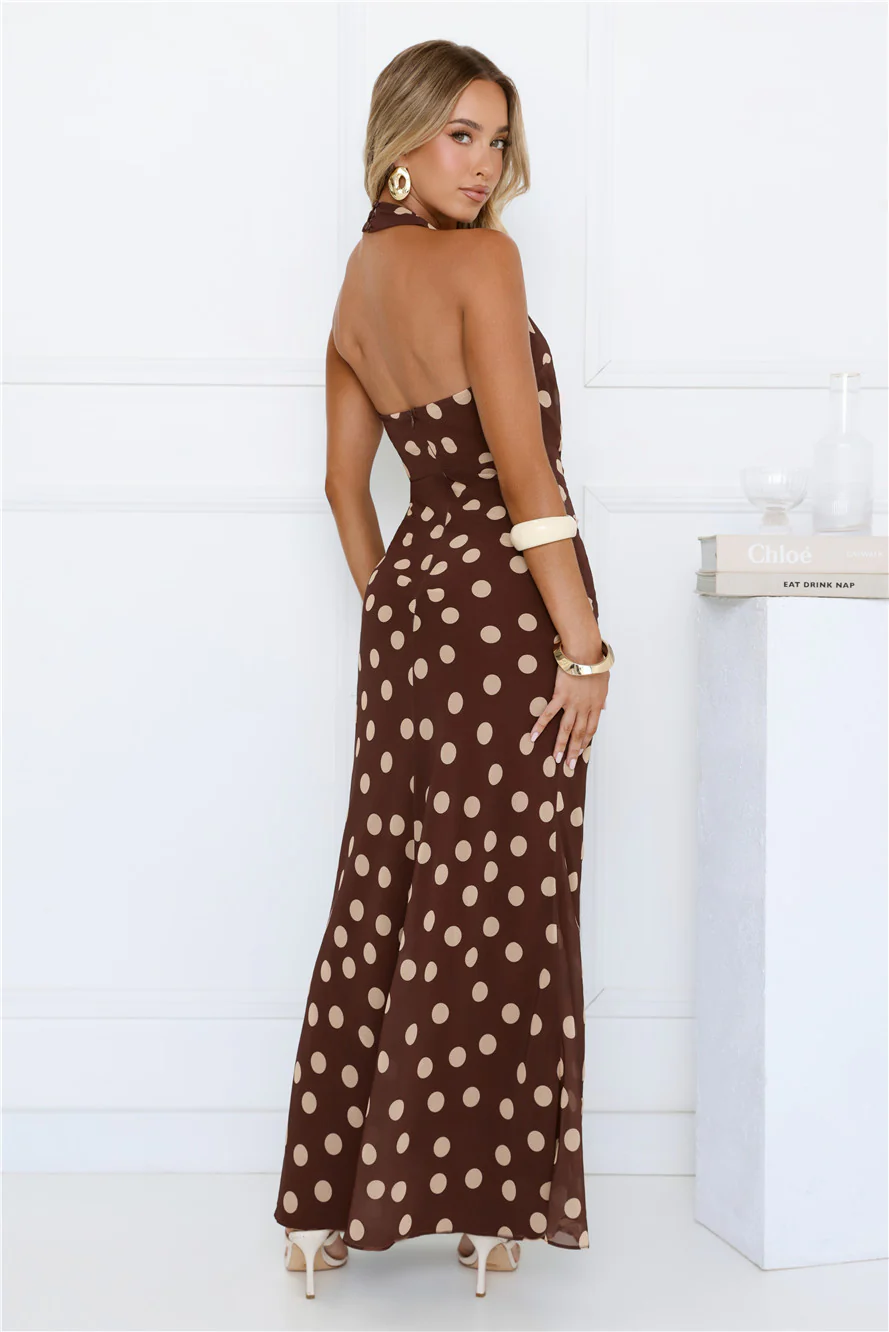 Nova Nights Halter Polka Dot Maxi Dress Brown