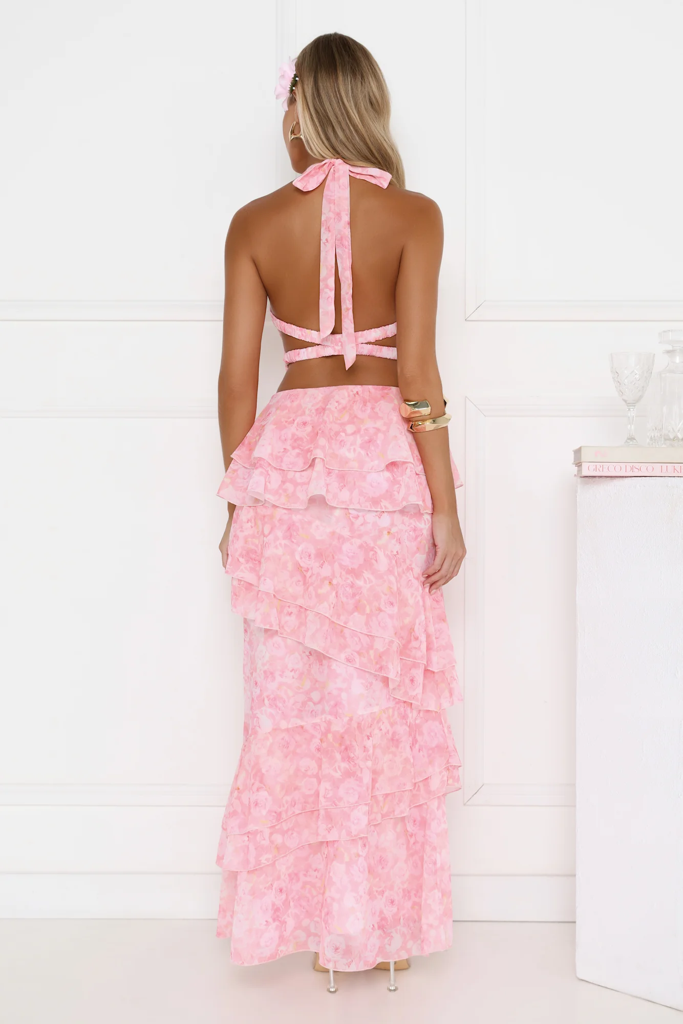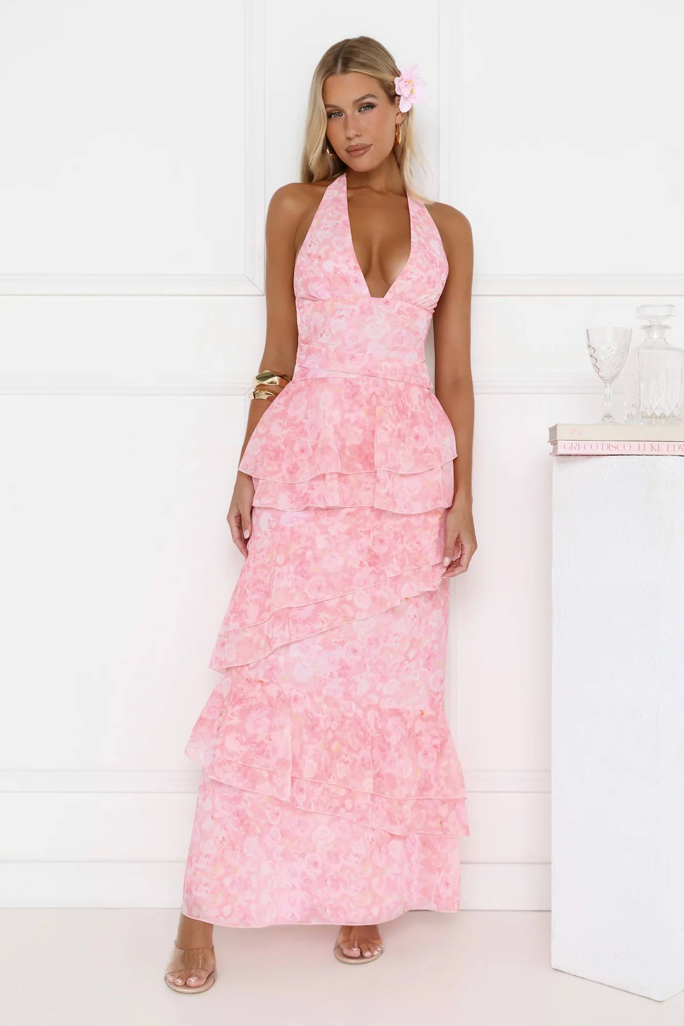 Tropical Bloom Halter Tiered Maxi Dress Pink