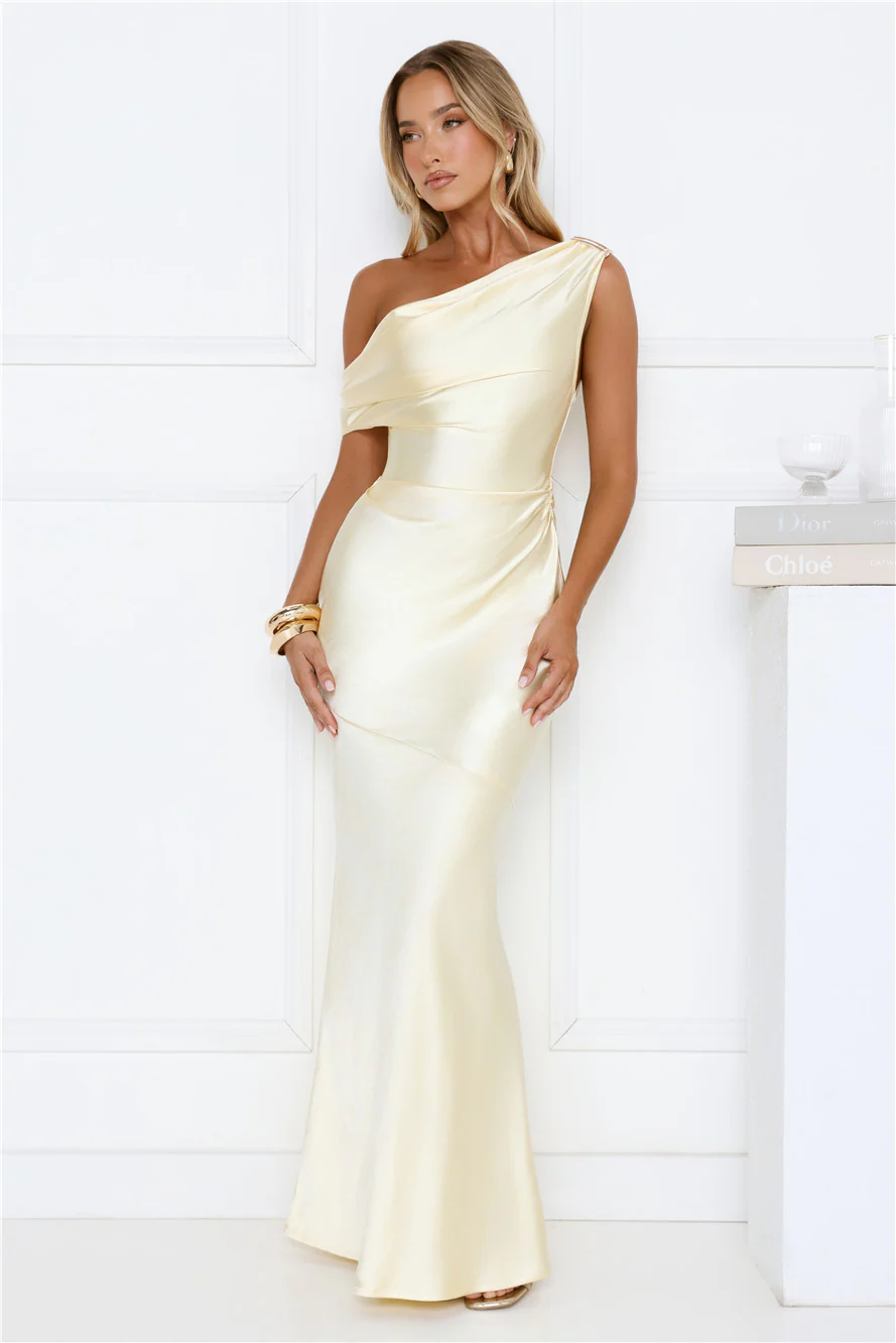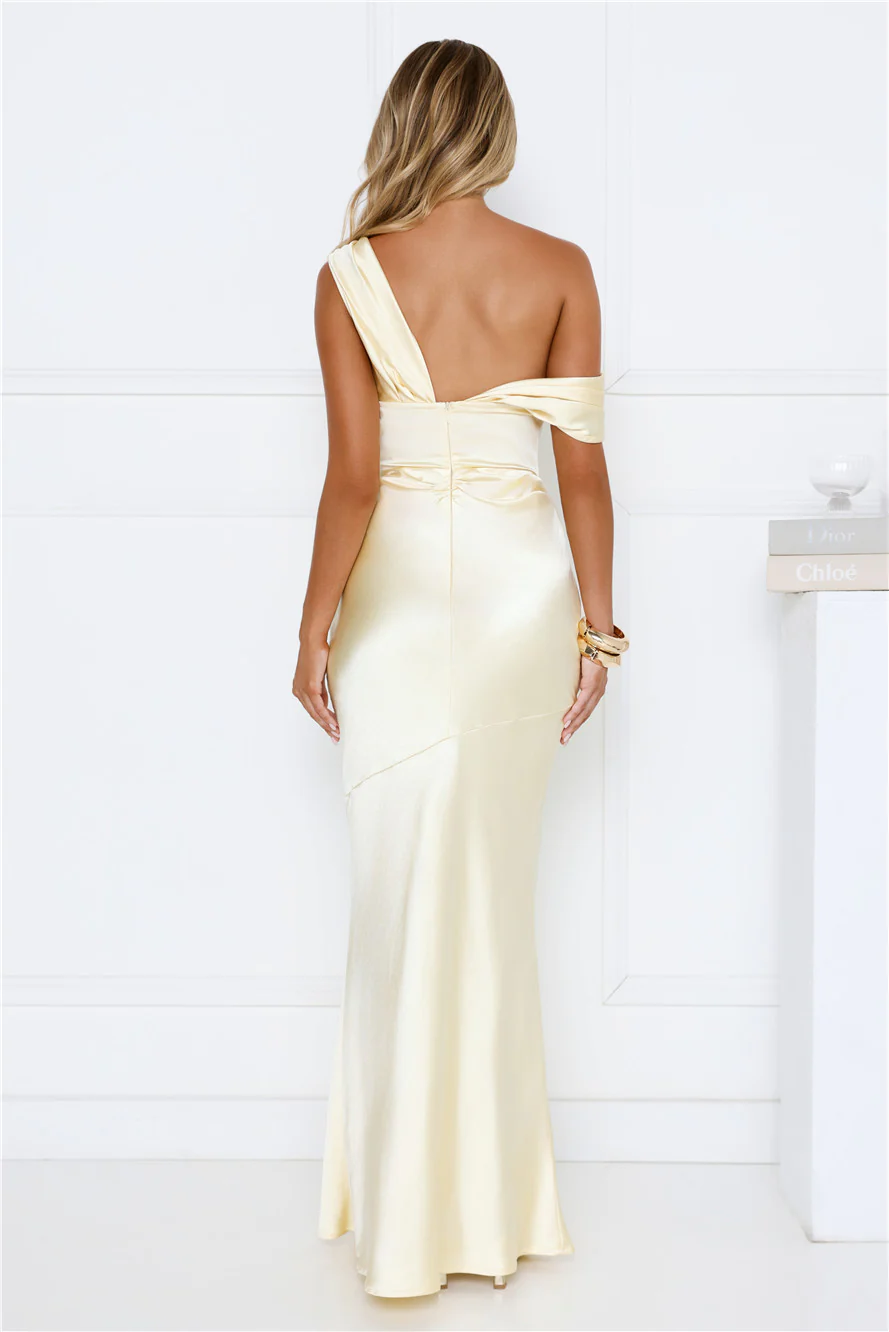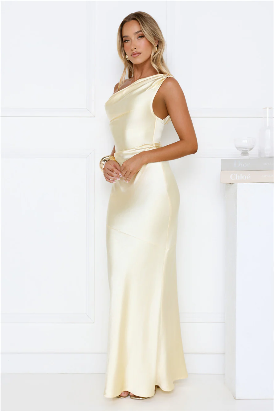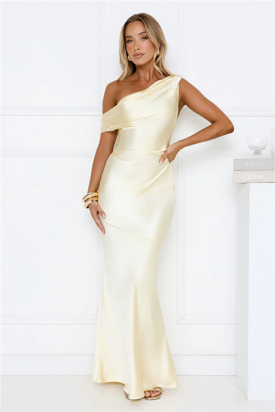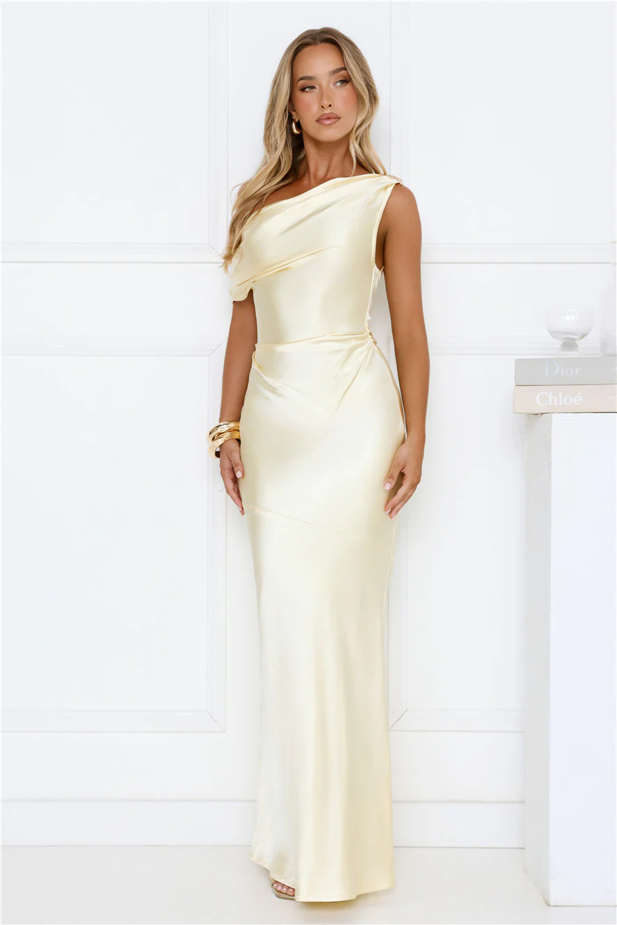 She’s A Dream Satin Off Shoulder Maxi Dress Yellow