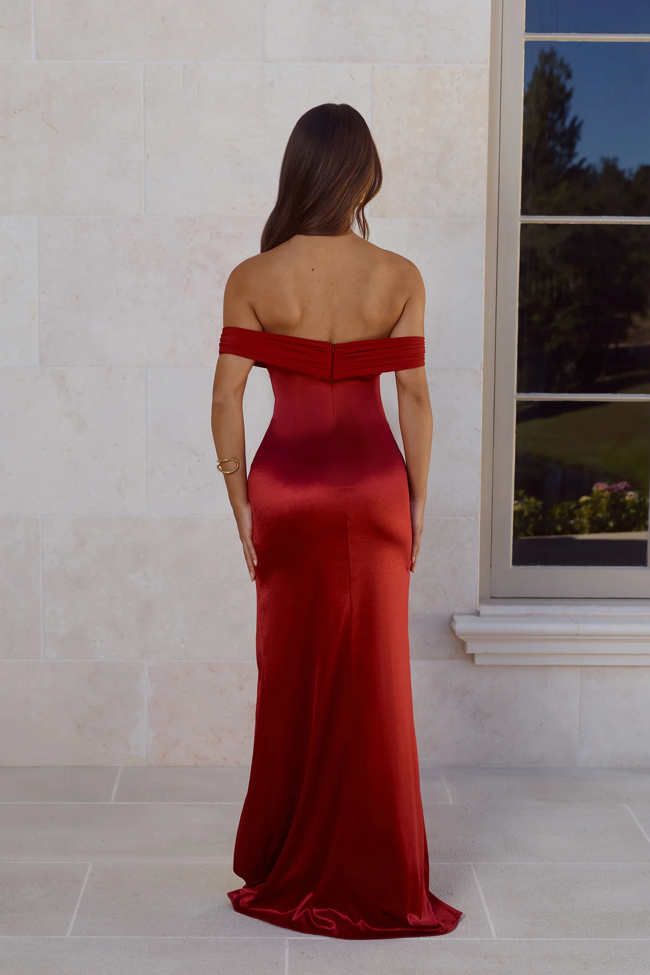 Couture Enchantment Off Shoulder Maxi Dress Red