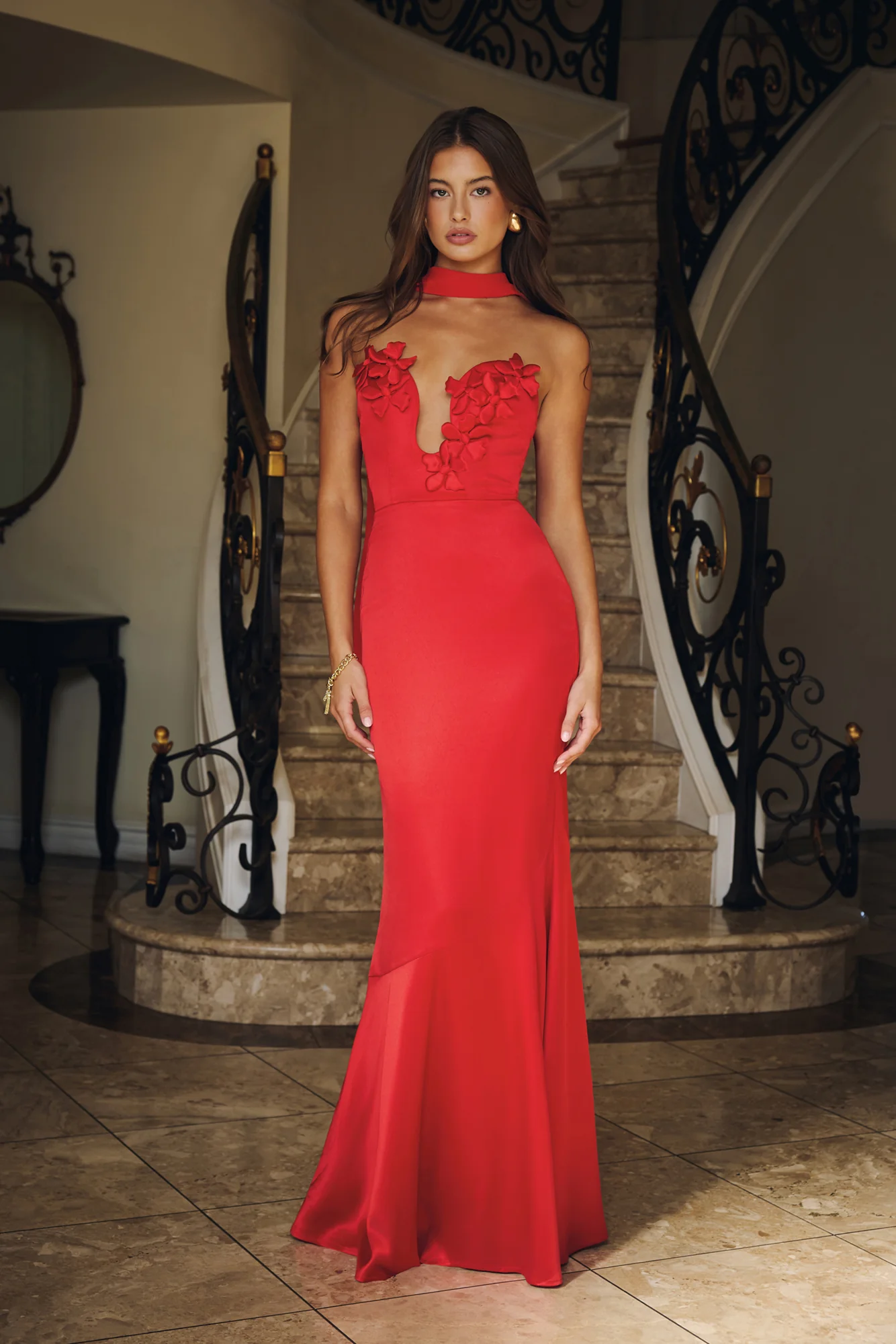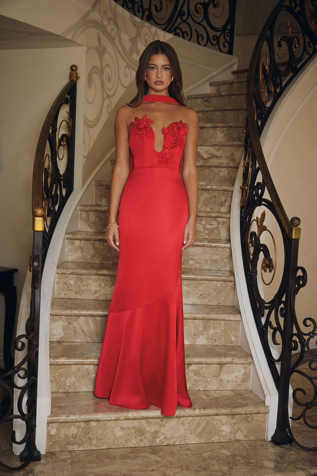 Wild Blossom Dance Strapless Satin Maxi Dress Red