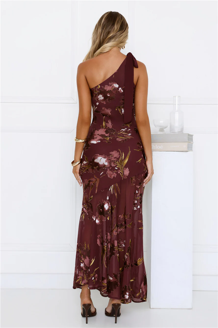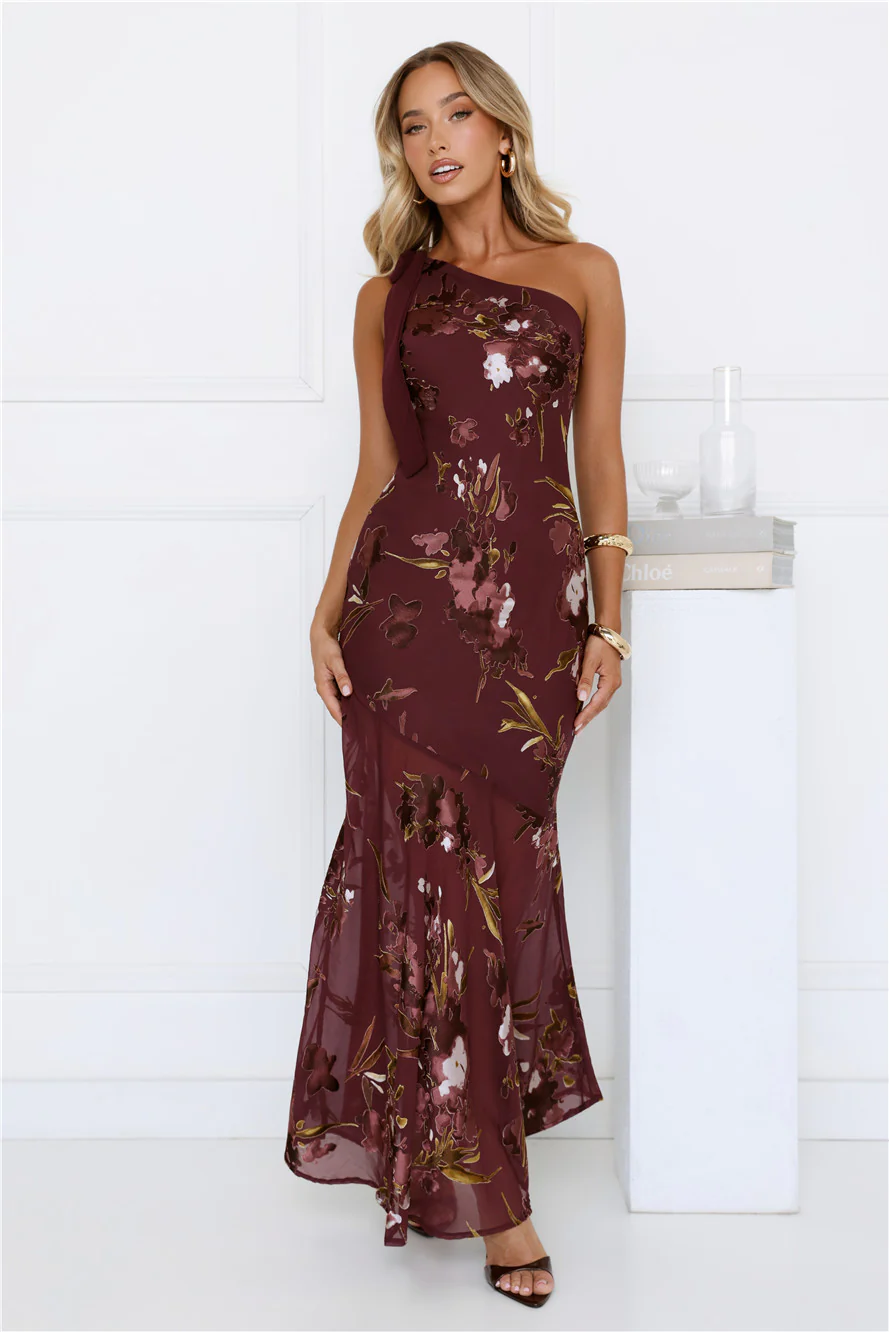 Opulent Bloom One Shoulder Maxi Dress Burgundy