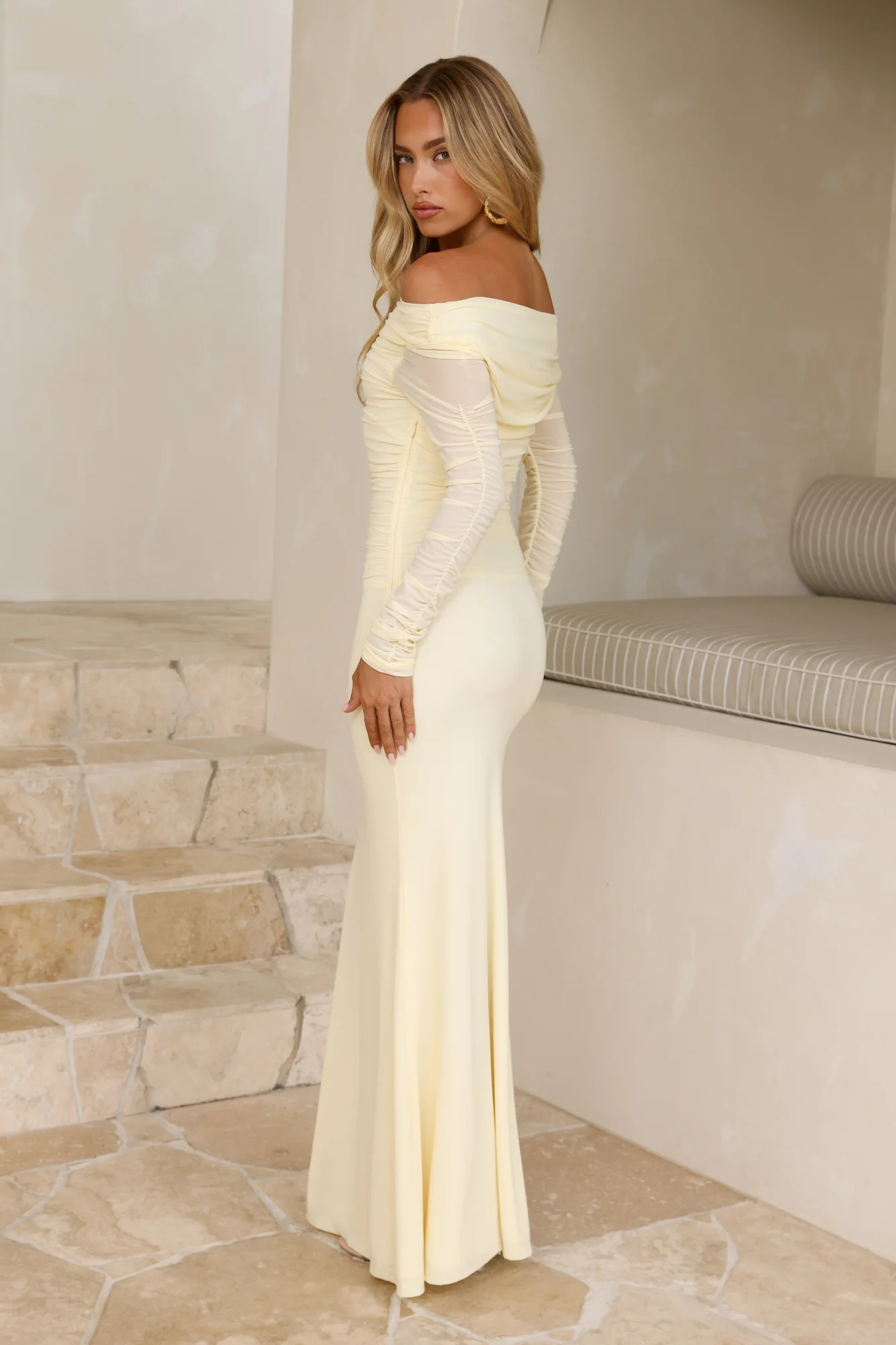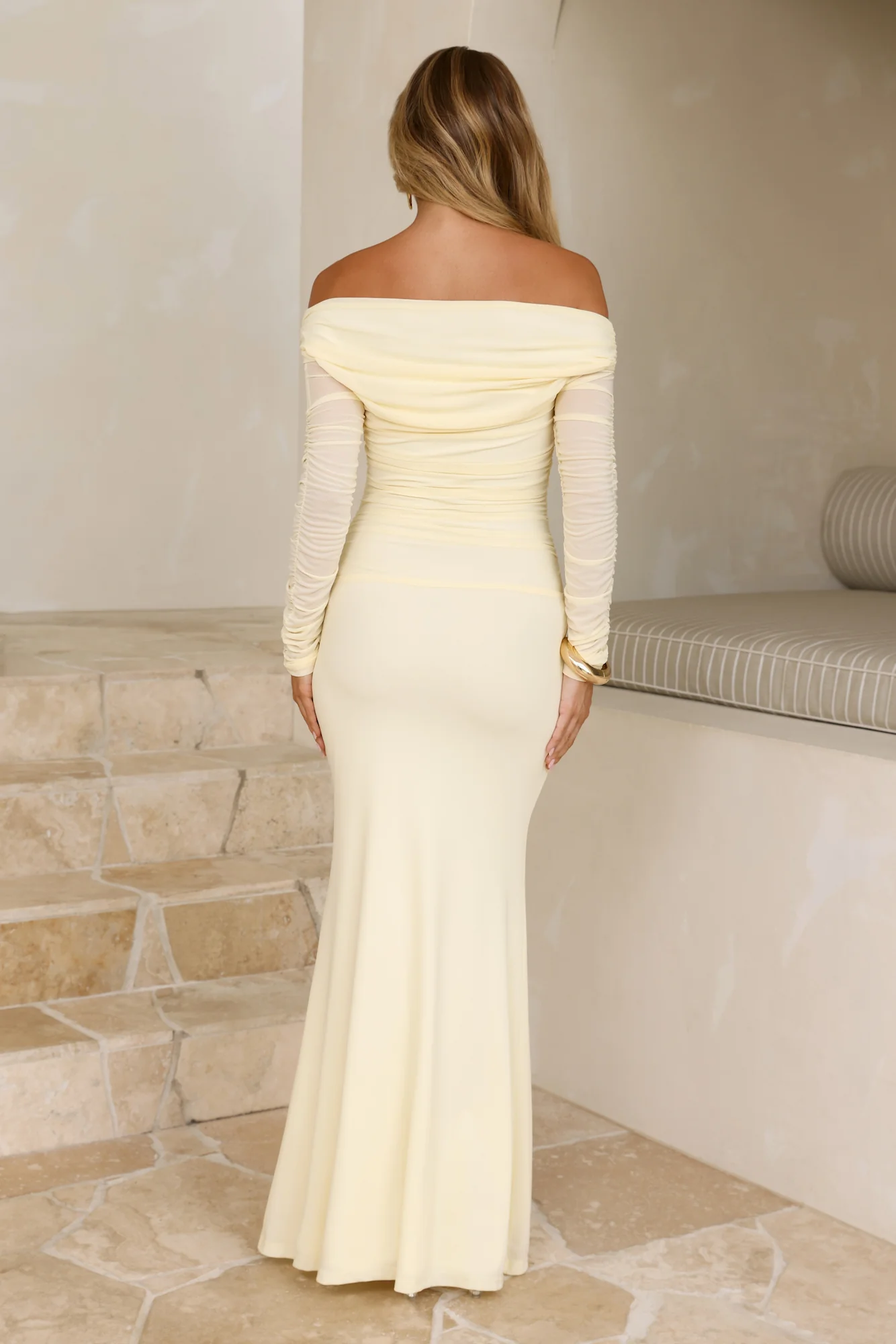 Glam Mesh Off-Shoulder Maxi Dress Yellow