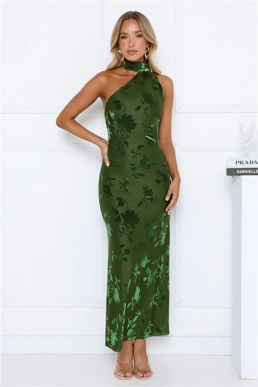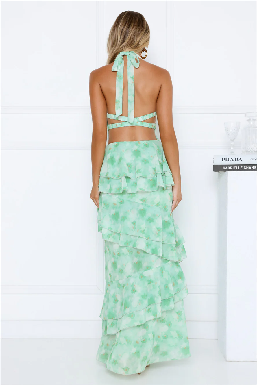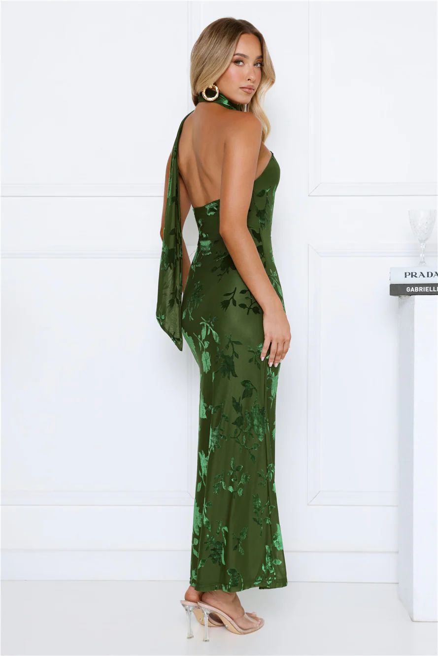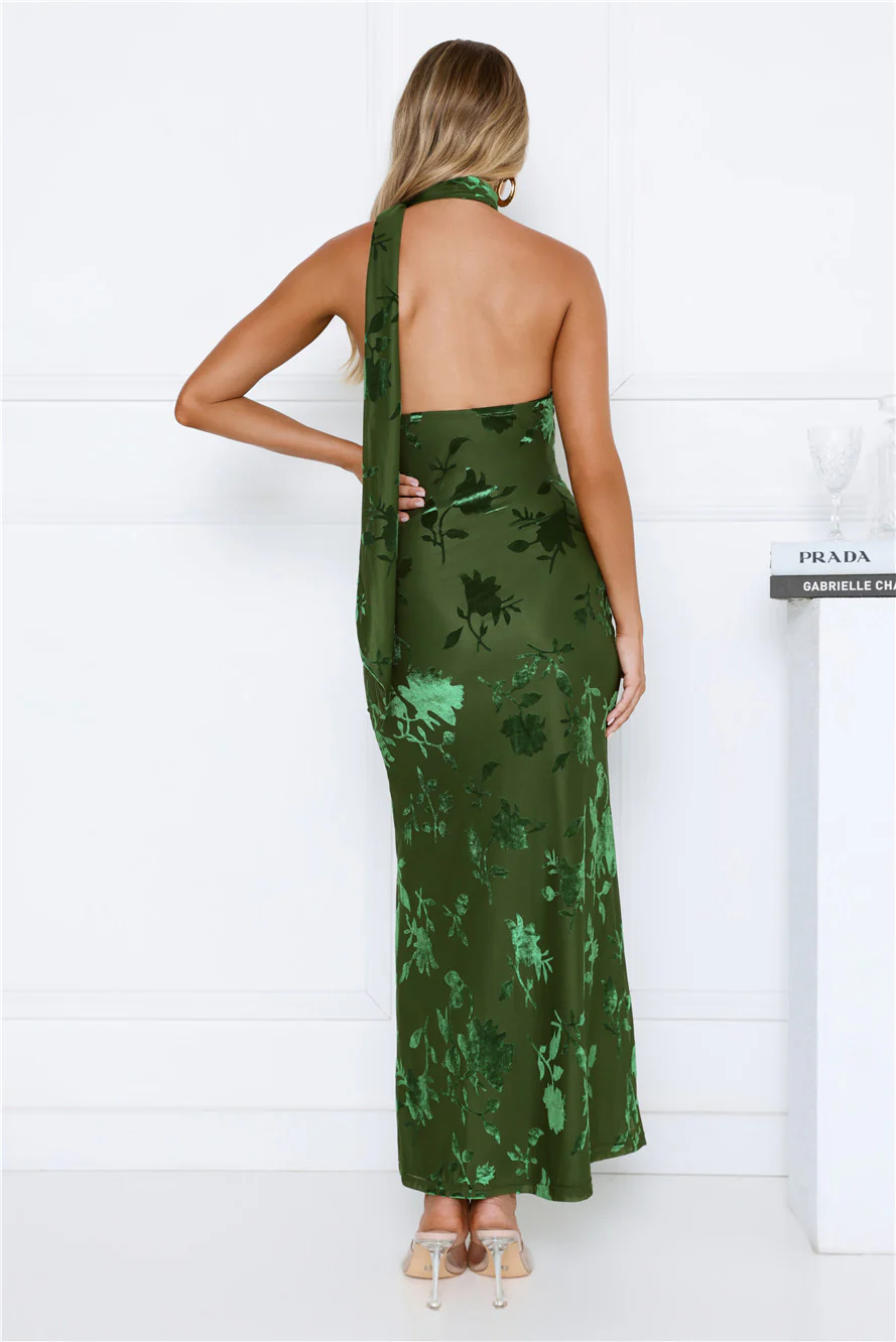 Summer Haze Floral Print Halter Maxi Dress Green
