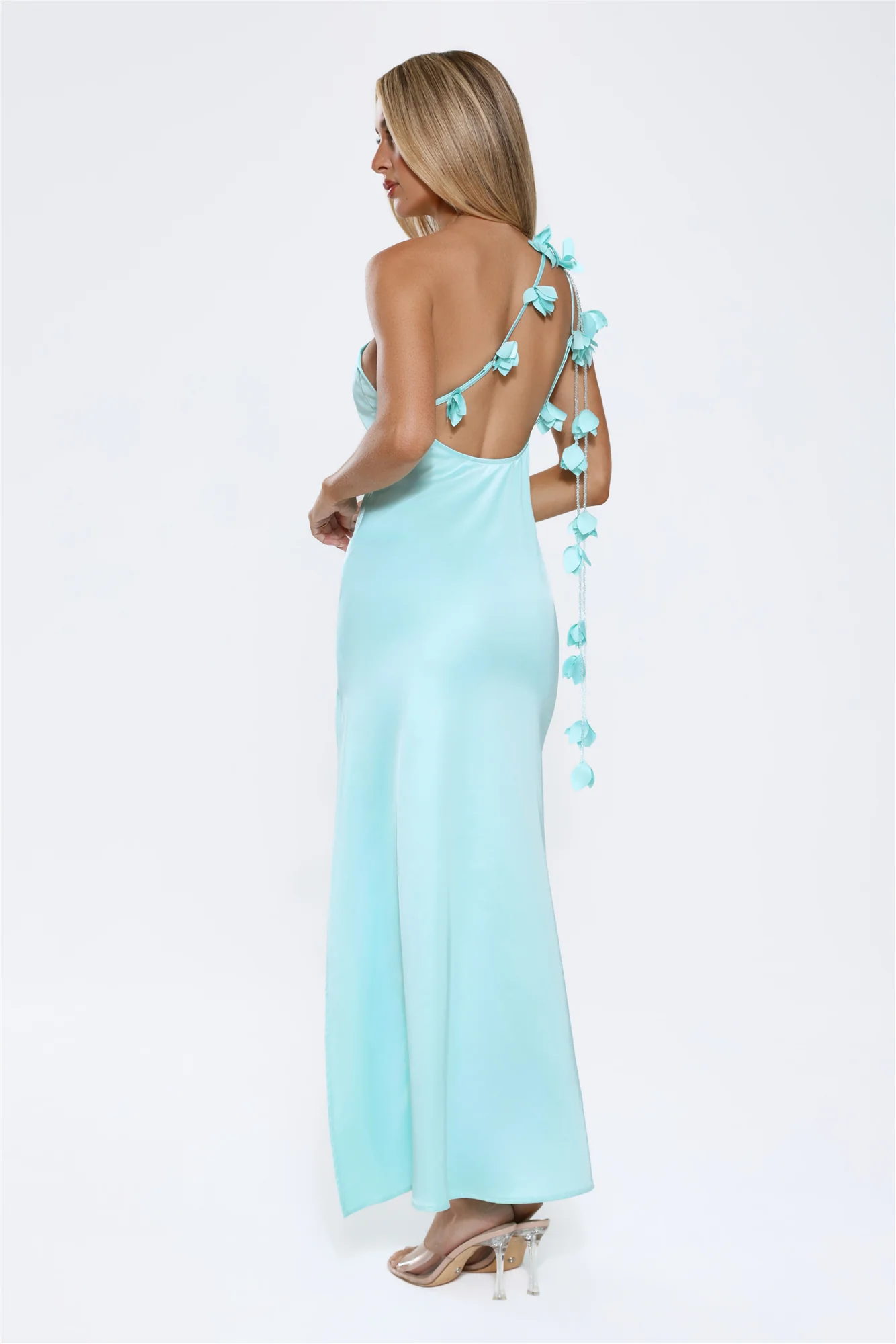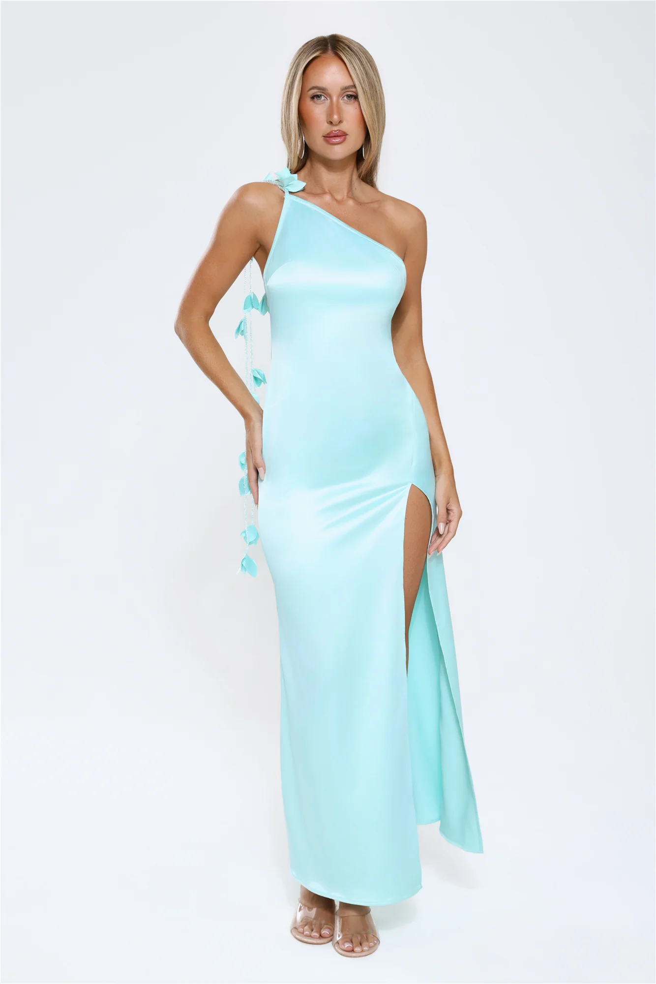 Romance Redefined One Shoulder Satin Maxi Dress Aqua