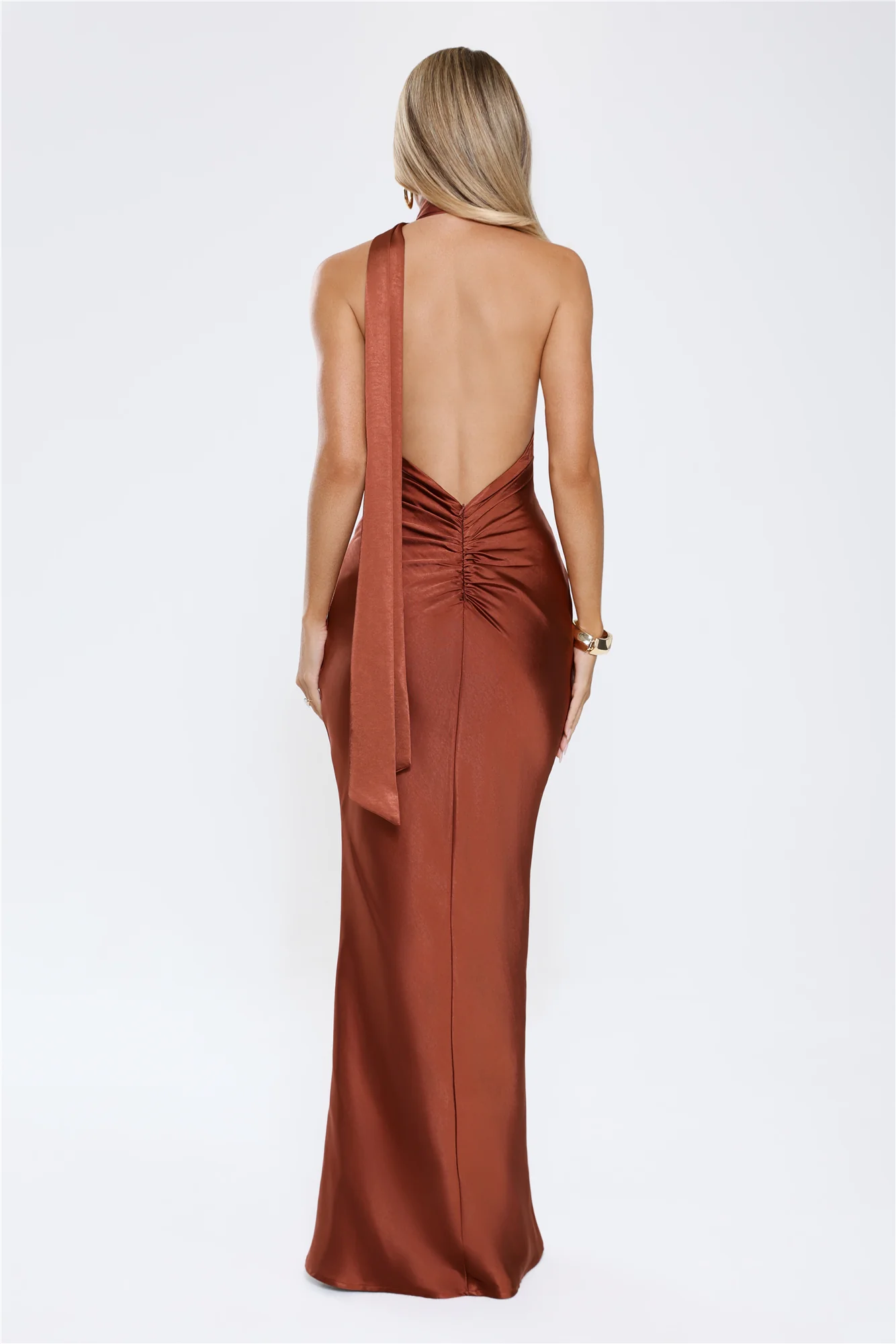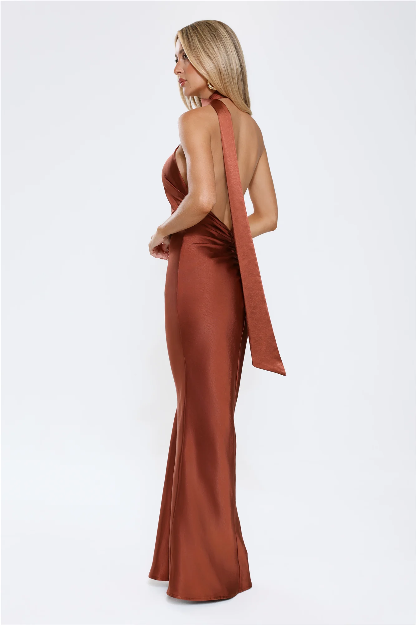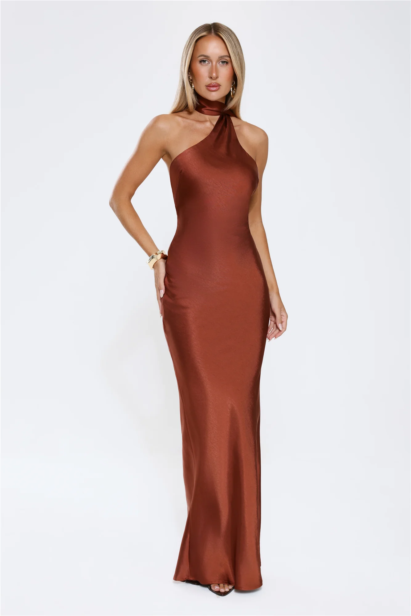 Cinnamon Glaze Halter Satin Maxi Dress Brown