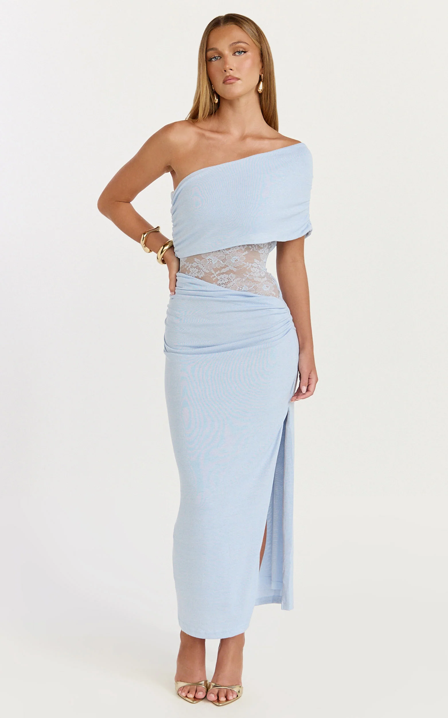 Juliet Midi Dress - One Shoulder Lace Contrast Bodycon Dress in Blue