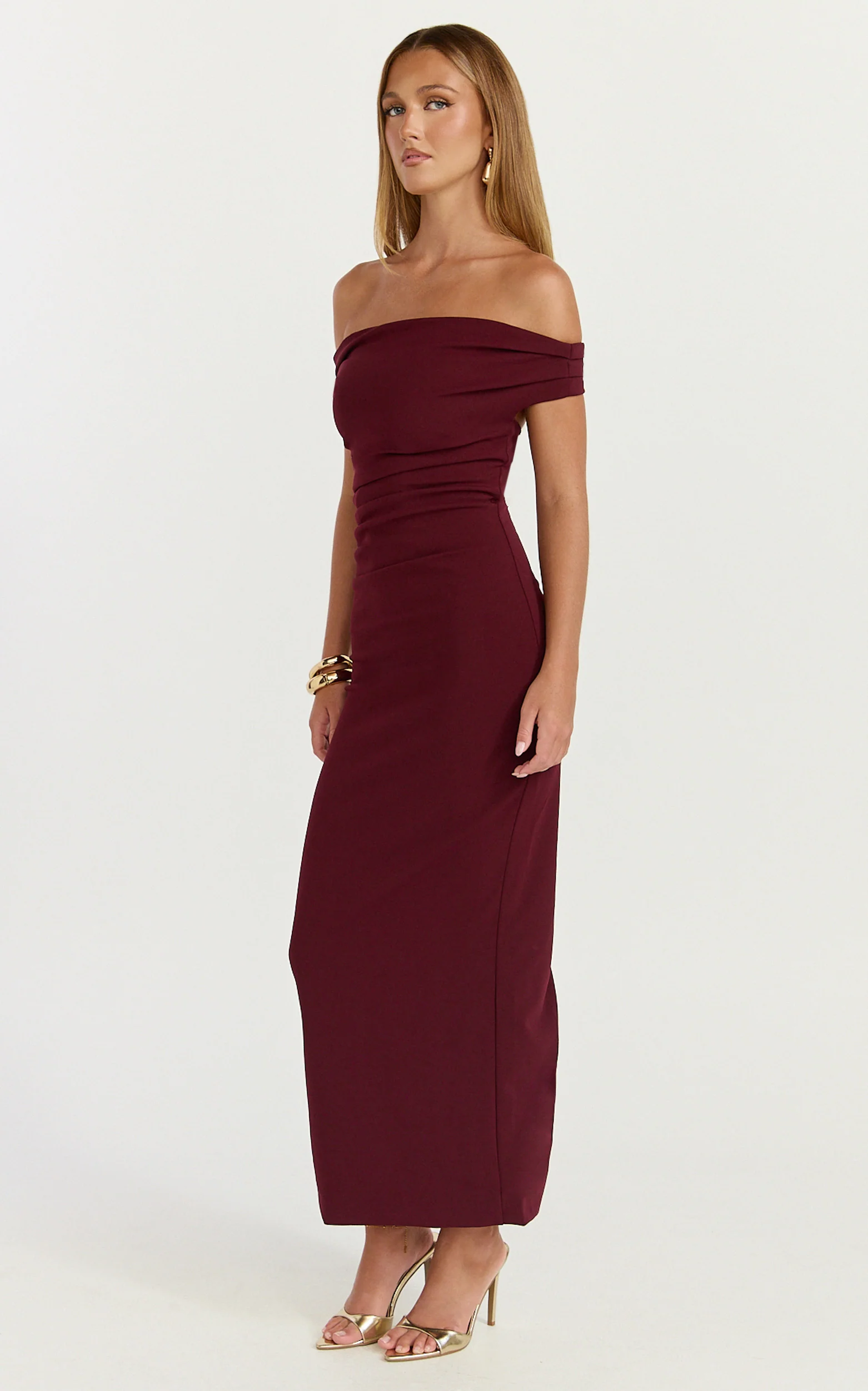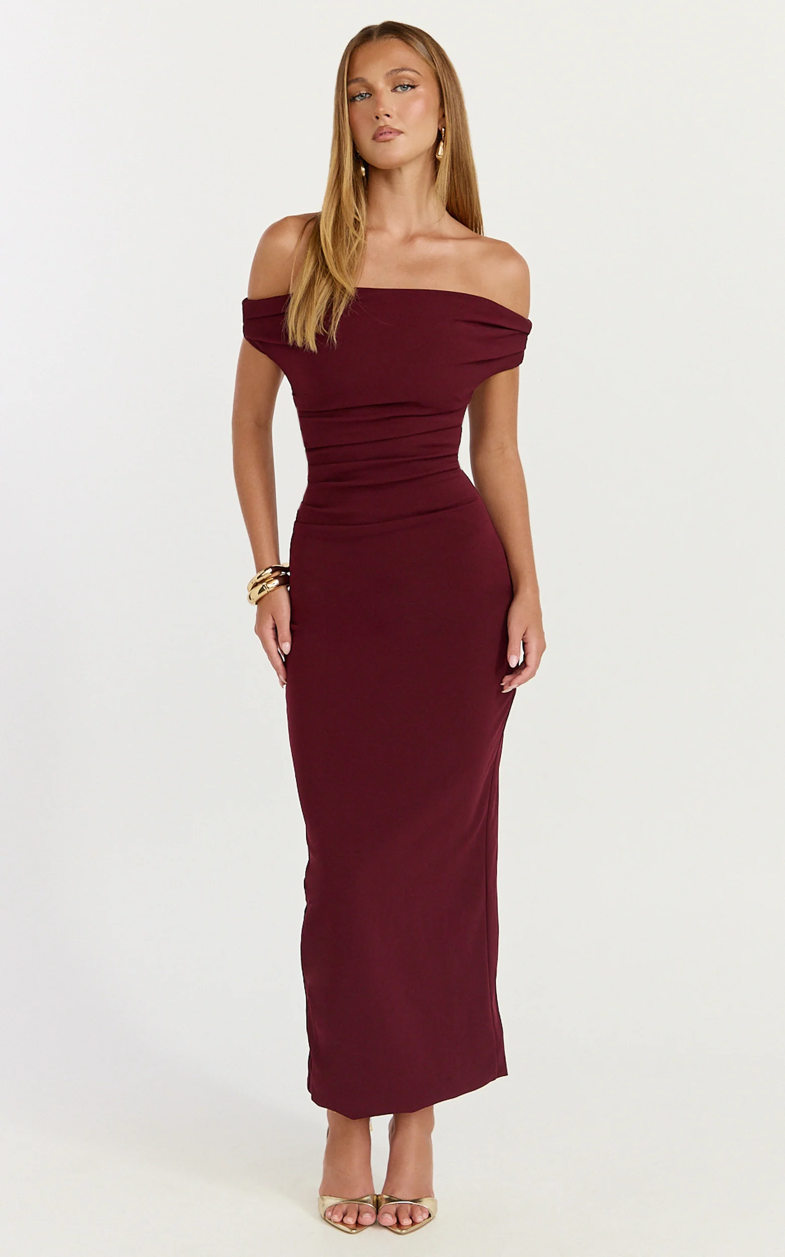 Lena Midi Dress - Off Shoulder Ruched Bodycon Dress in Wine