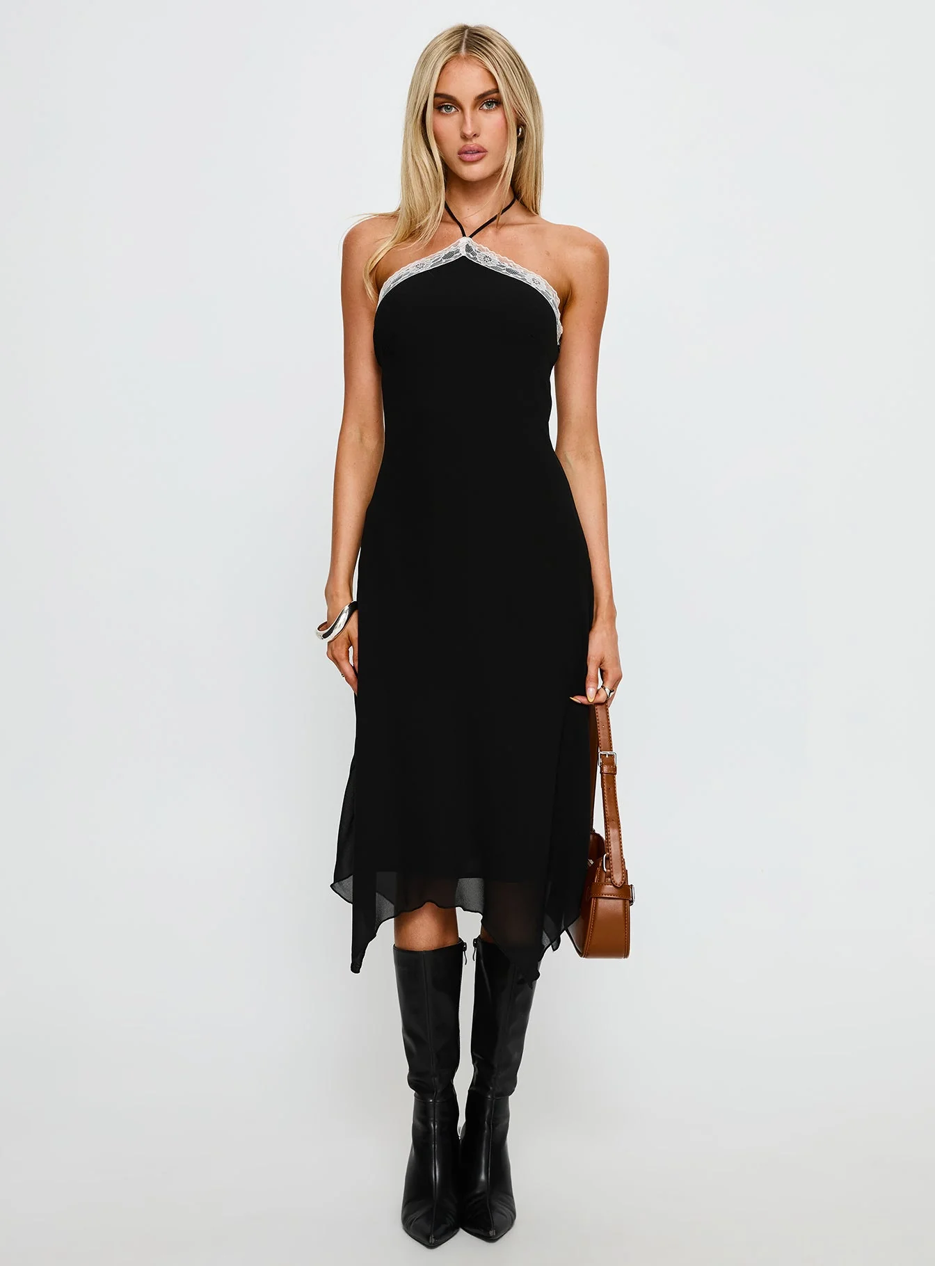 Naila Halter Lace Trim Midi Dress Black