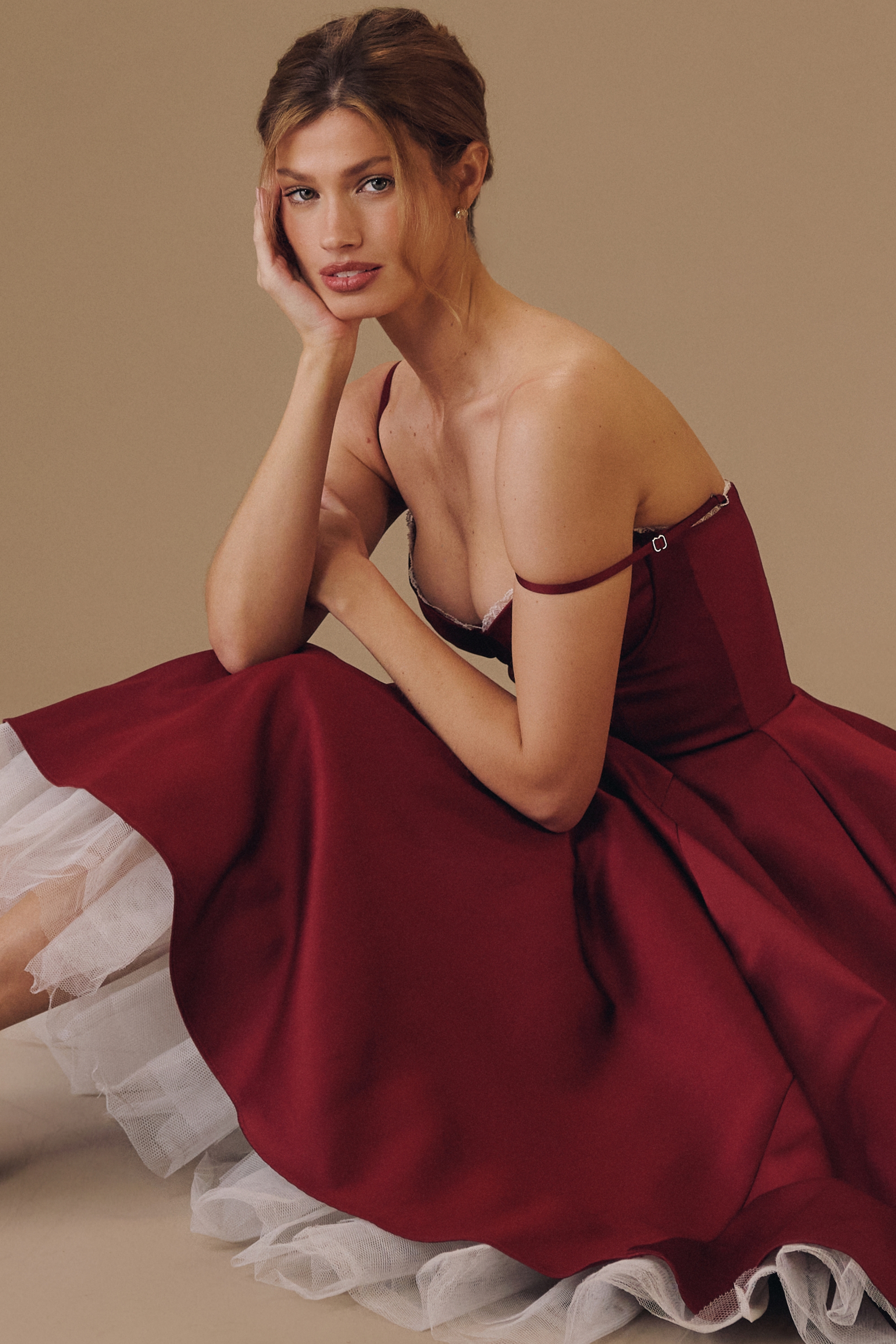 wine satin tulle midi dress