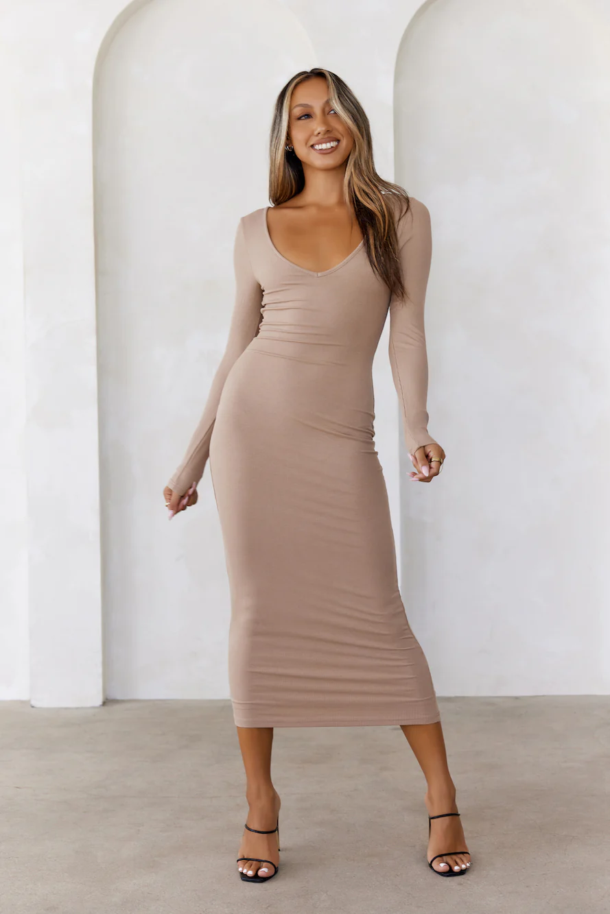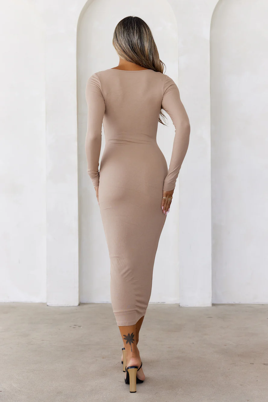 BASE The Must Own Long Sleeve Ribbed Midi Dress Latte