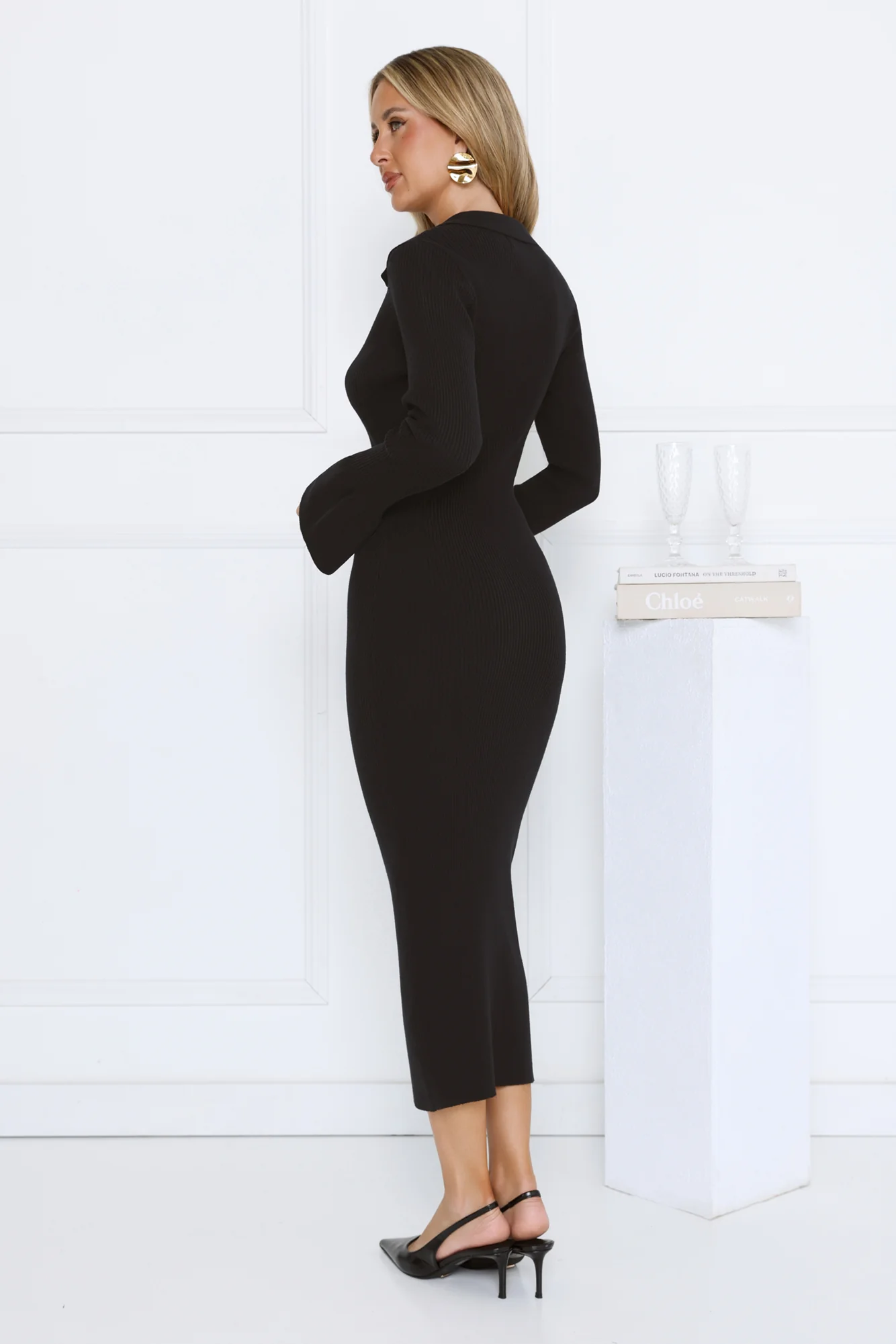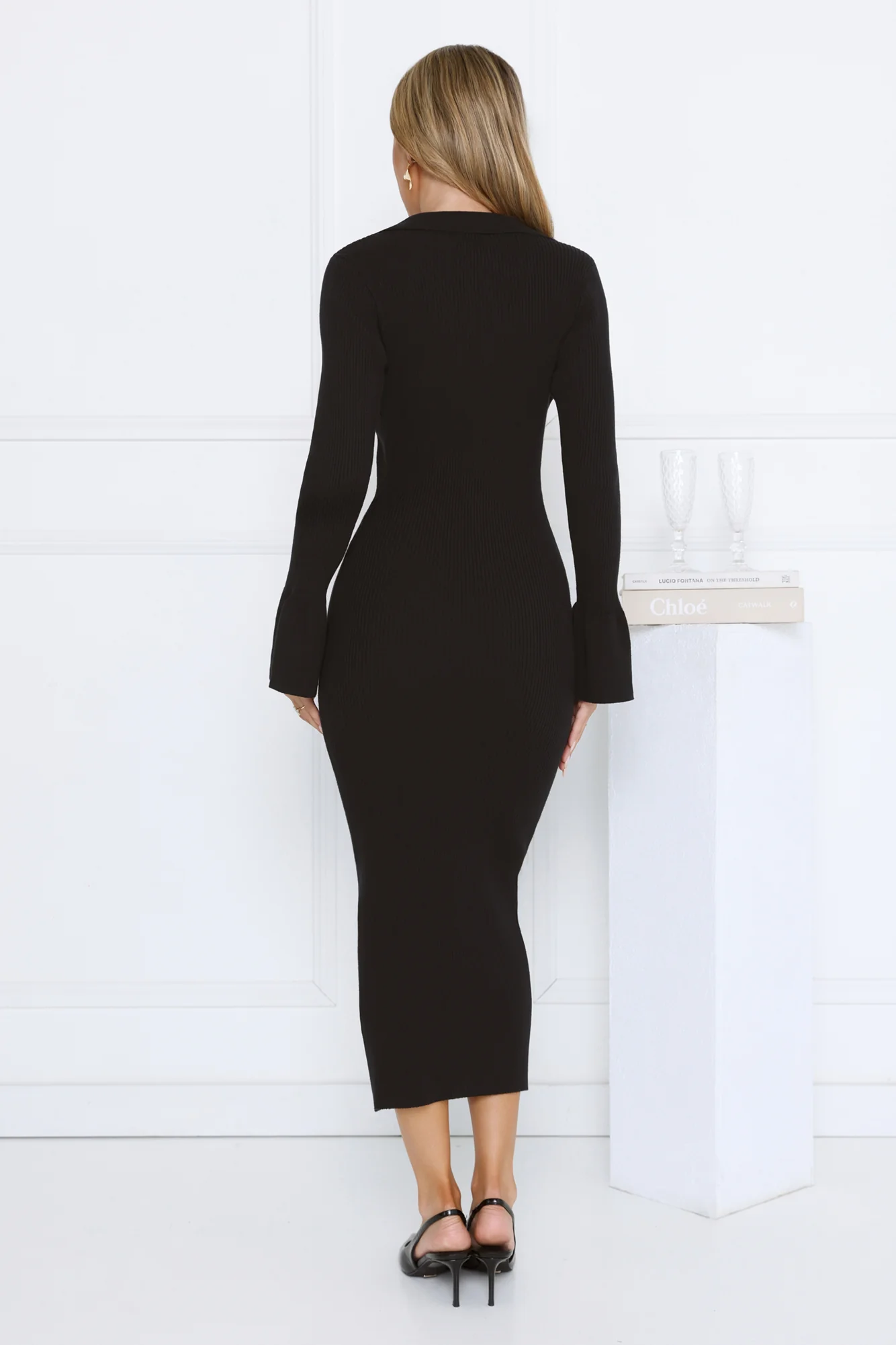 Snow Kiss Soirée Ribbed Midi Dress Black