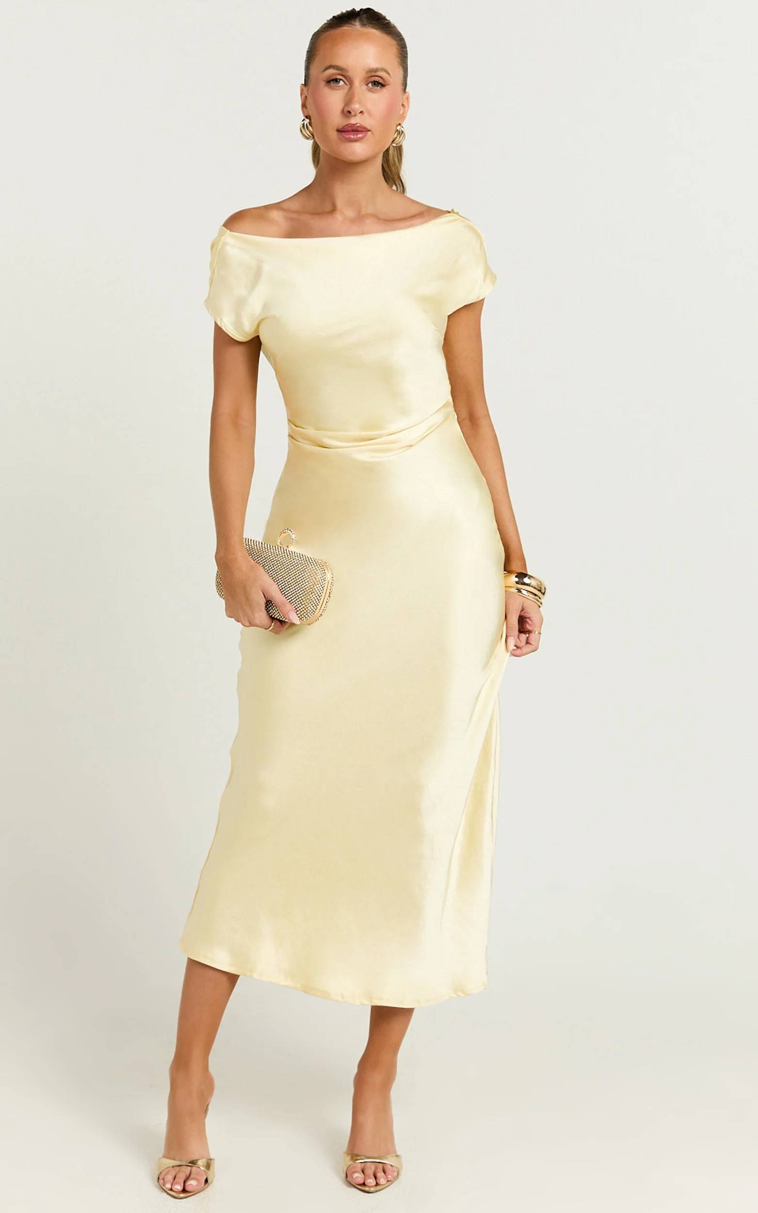 Cincinnati Midi Dress - Off The Shoulder Side Split Column Linen Dress in Lemon