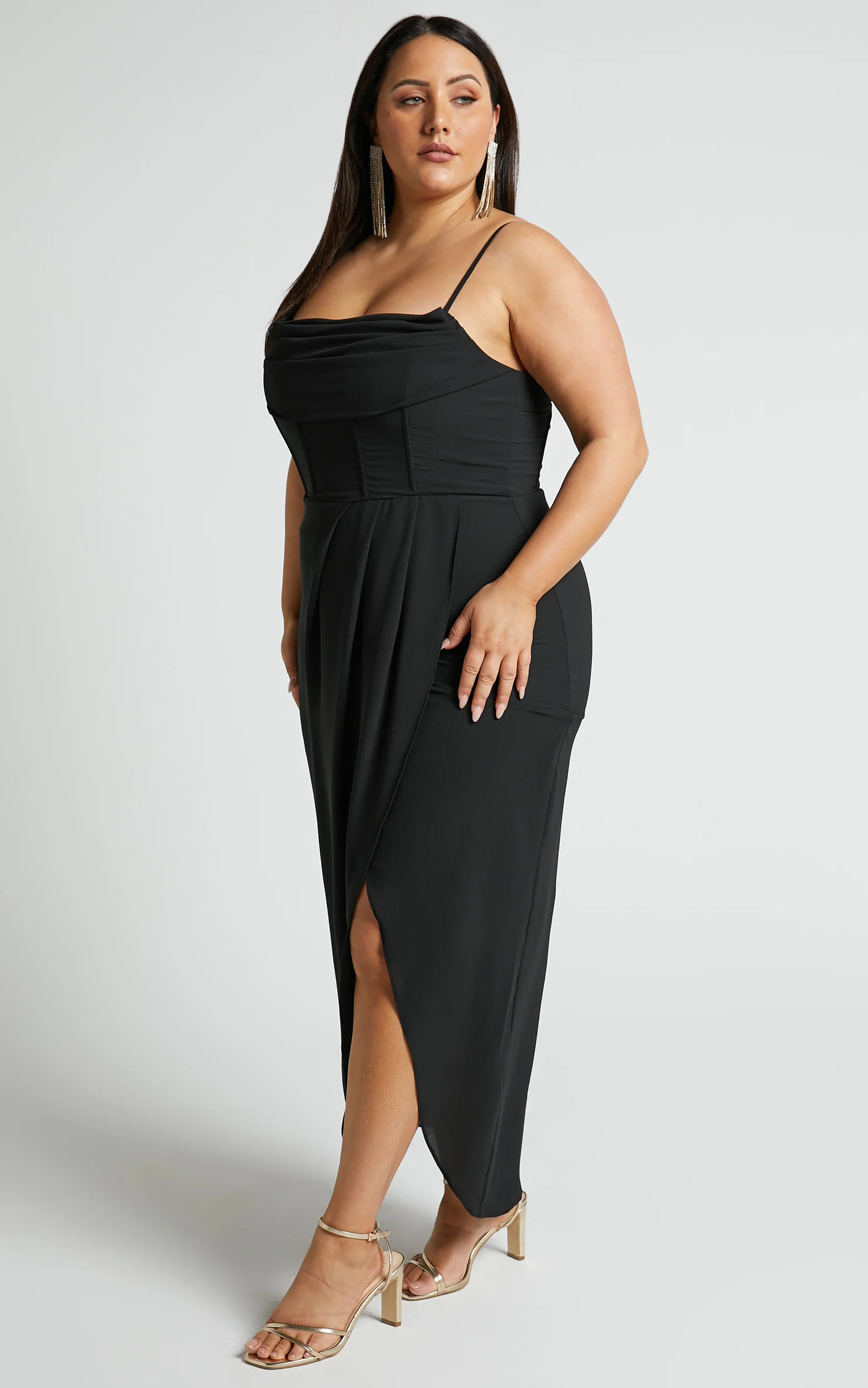 Andrina Midi Dress - High Low Wrap Corset Dress in Black