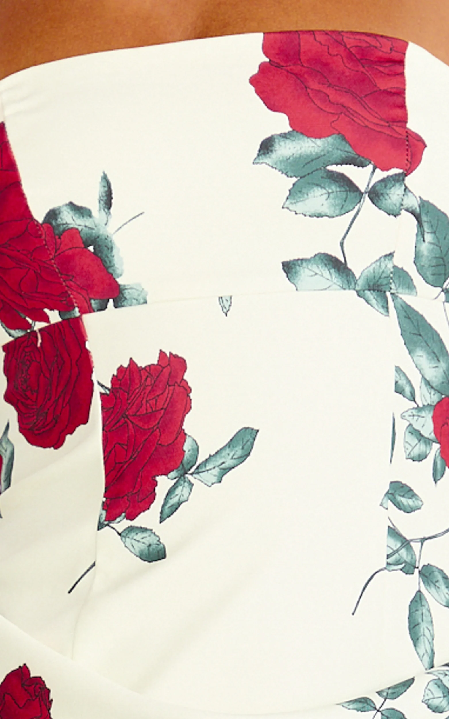 Dahlia Midi Dress - Strapless Draped Cowl Waist Fitted Dress in Scarlet Rose Print