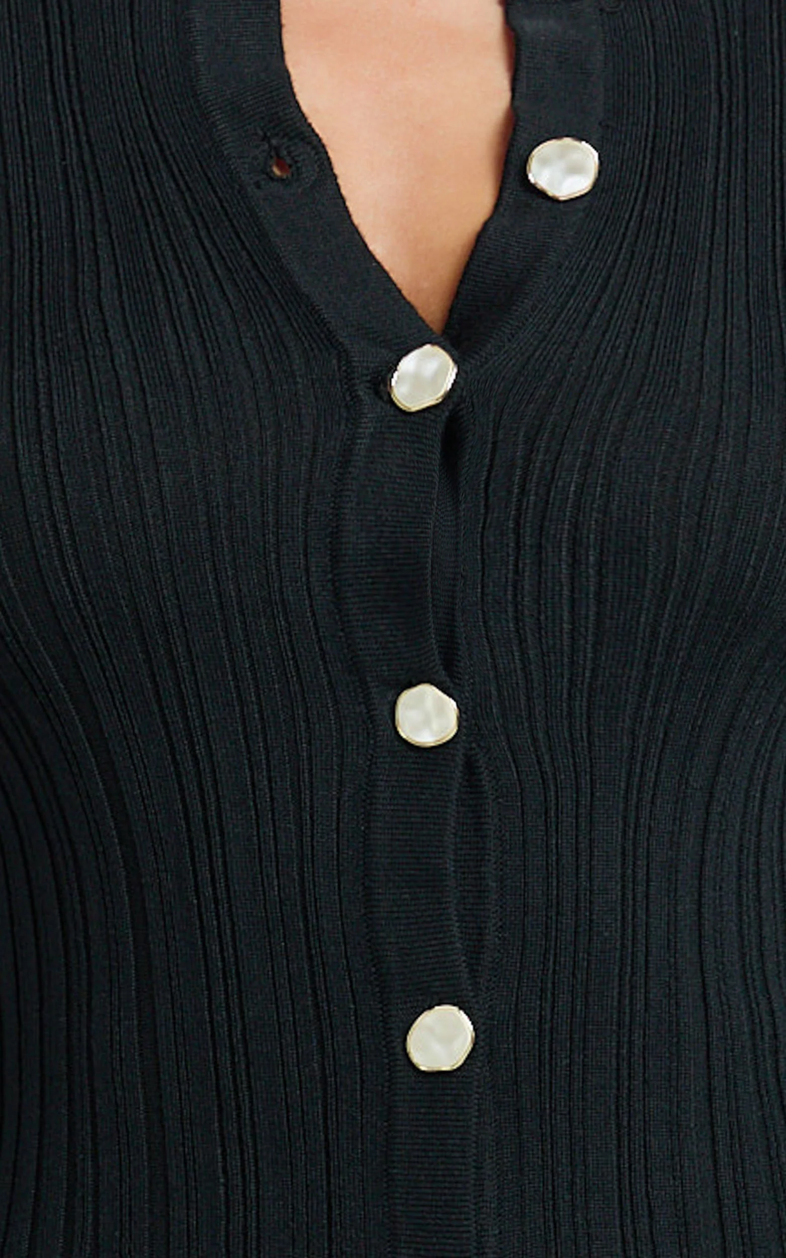 Celia Mini Dress - High Neck Square Shoulder Button Front Ruche Waist Knit Dress in Black