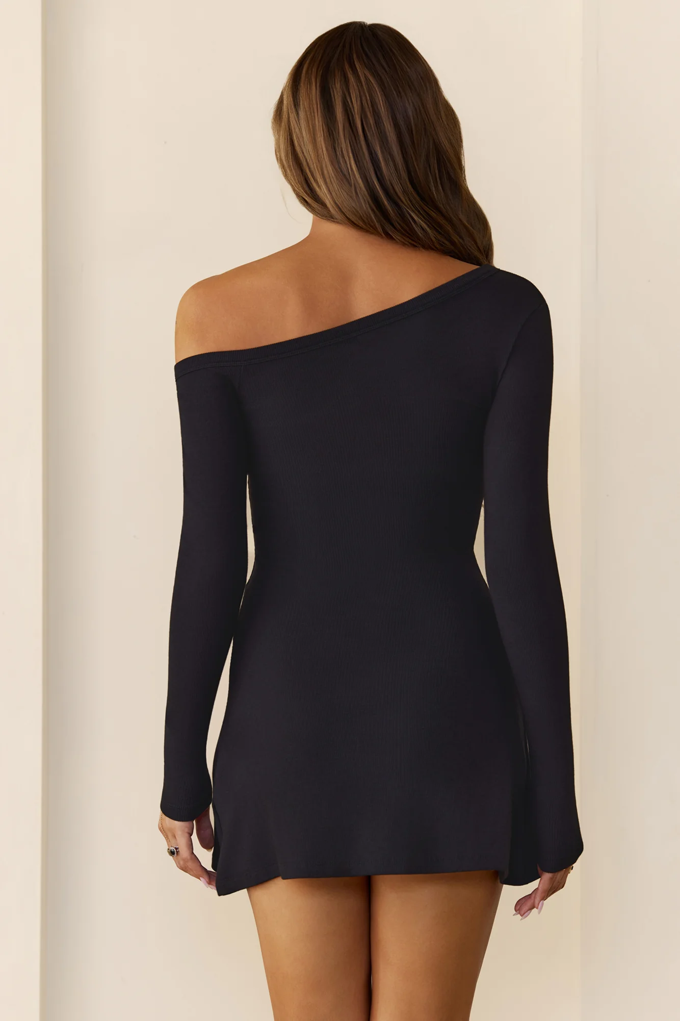 BASE Luxe Rib Off Shoulder Long Sleeve Mini Dress Black