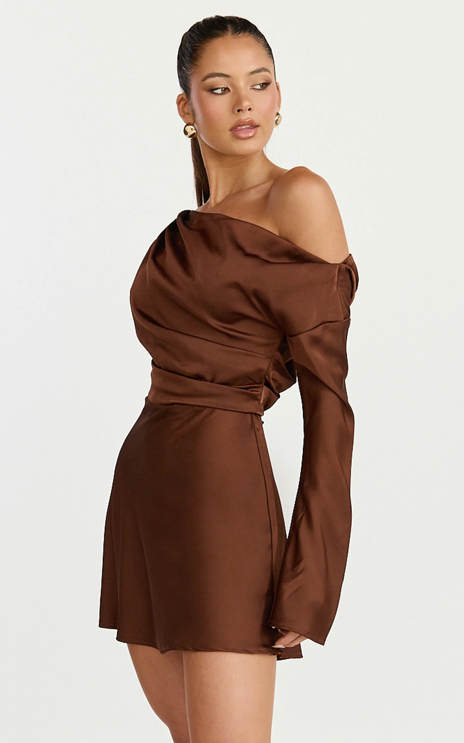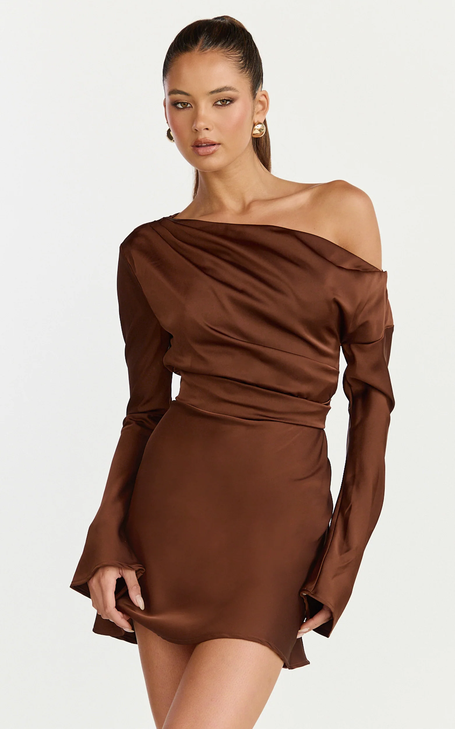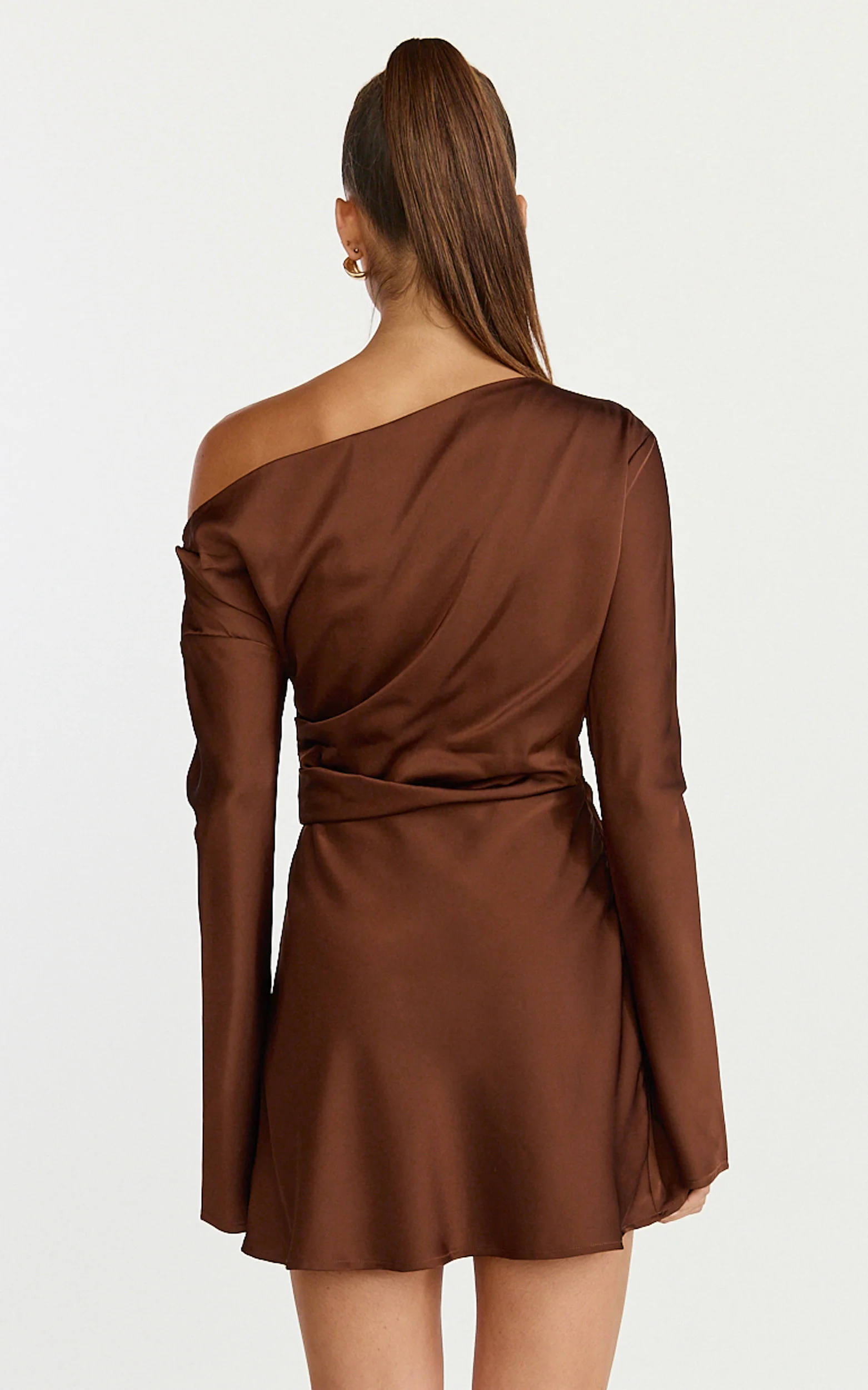 Sienna Mini Dress - Tipped Shoulder Long Sleeve Dress in Chocolate