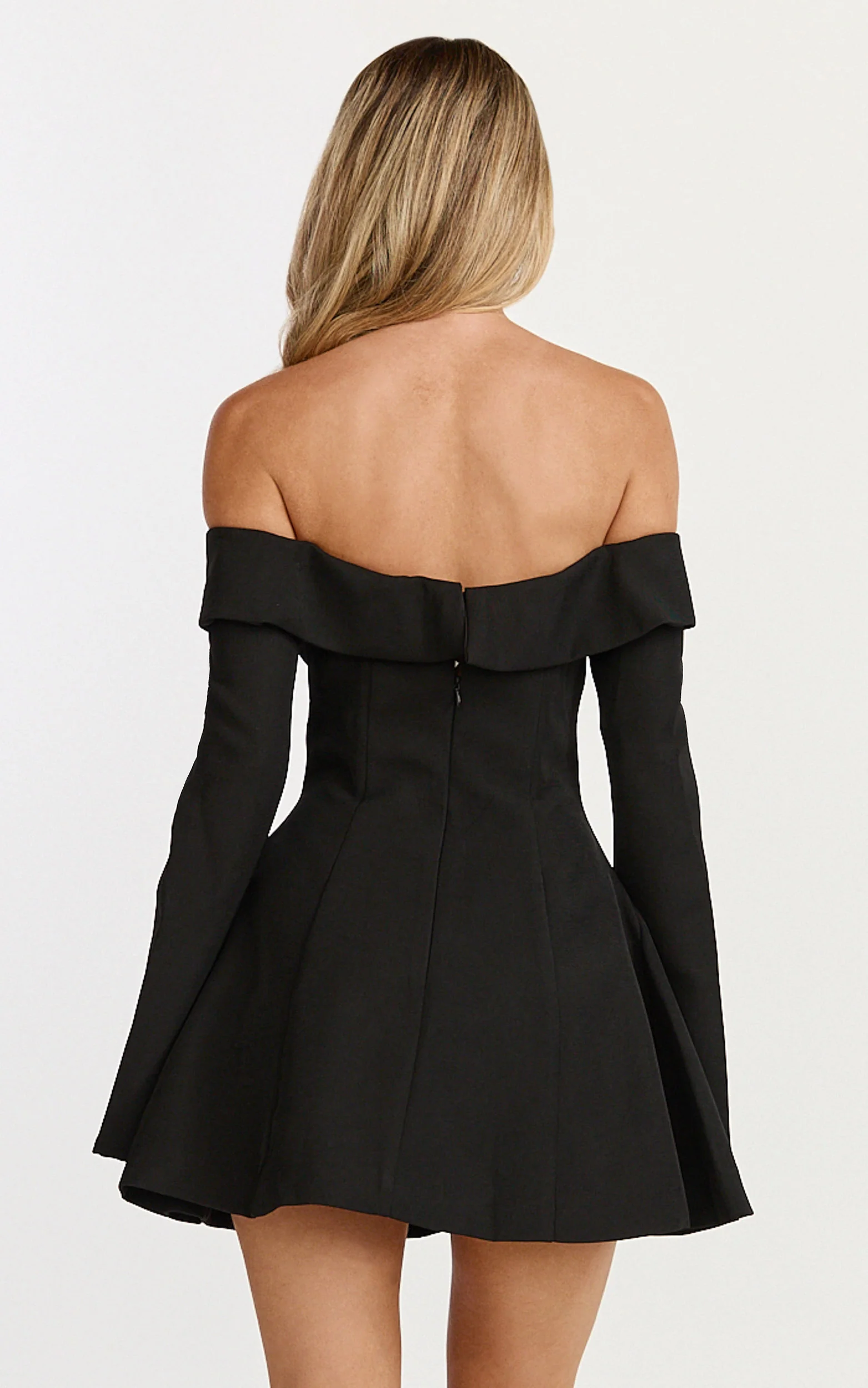 Collette Mini Dress - Off Shoulder Long Sleeve Godet Flare Dress in Black