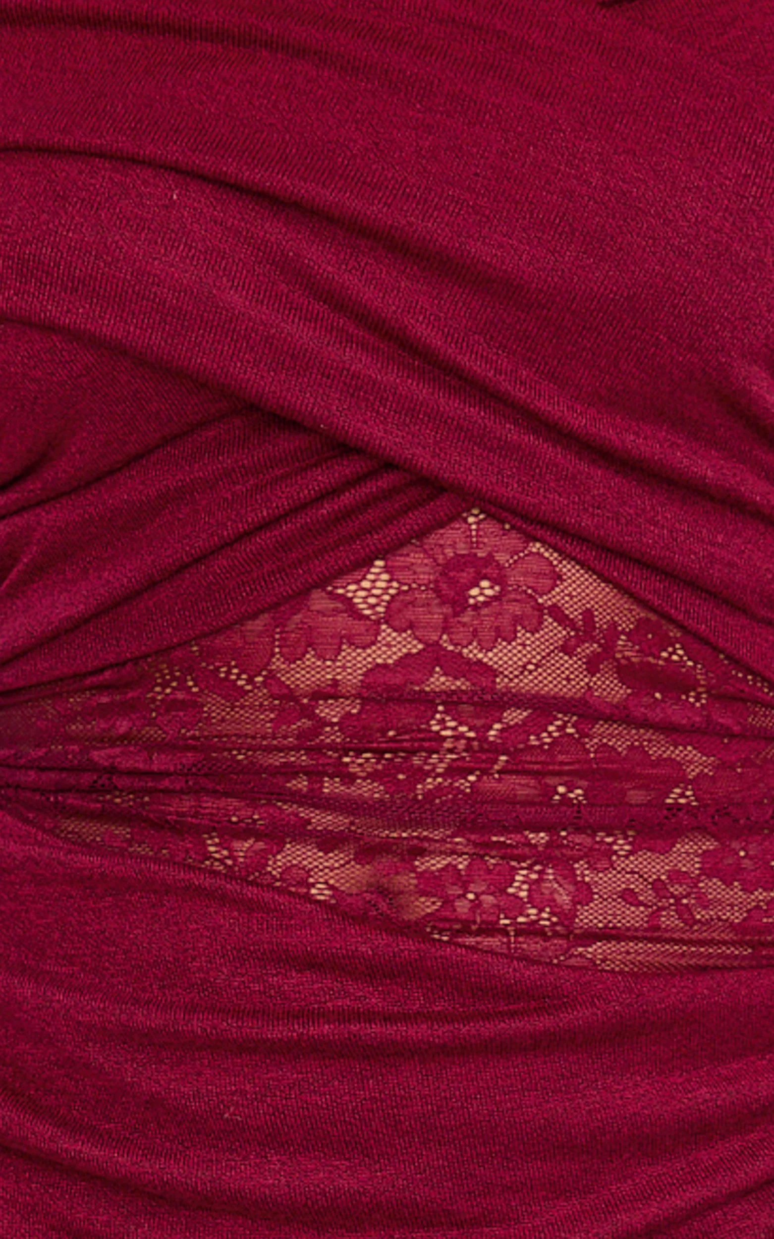 Juliet Mini Dress - Off Shoulder Lace Contrast Bodycon Dress in Wine
