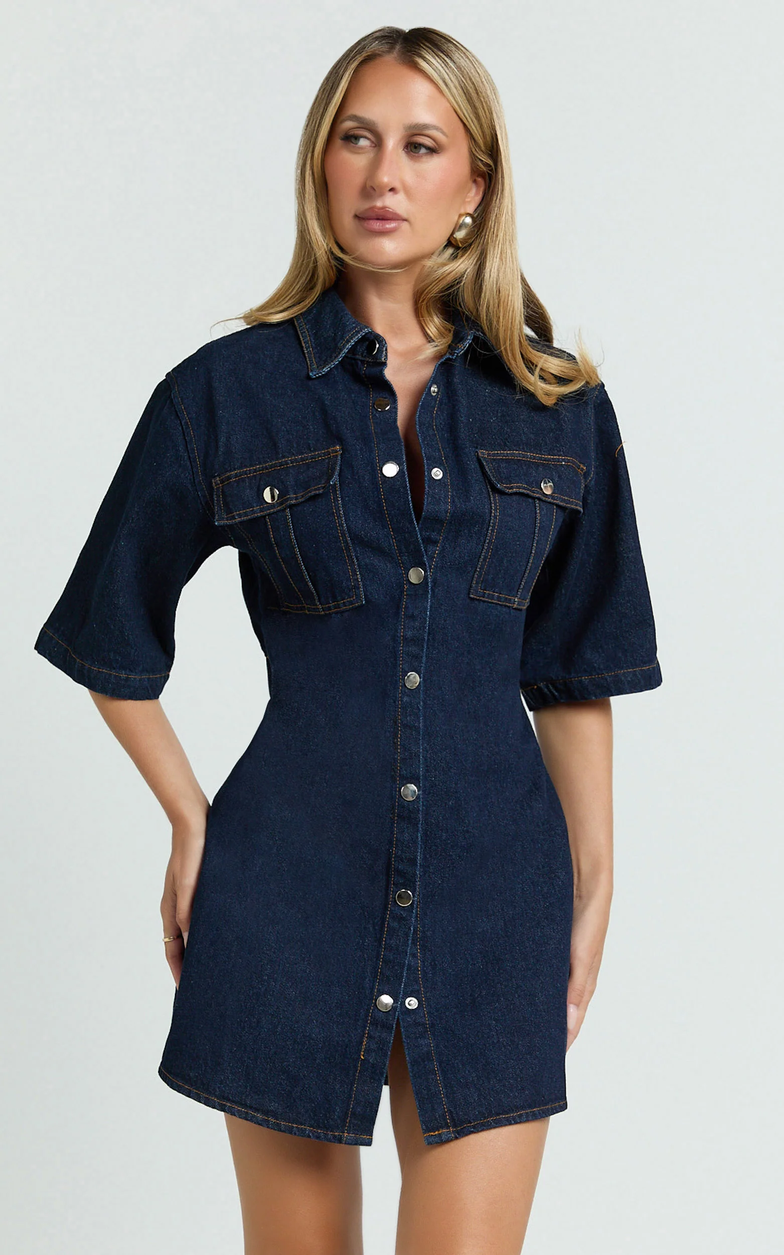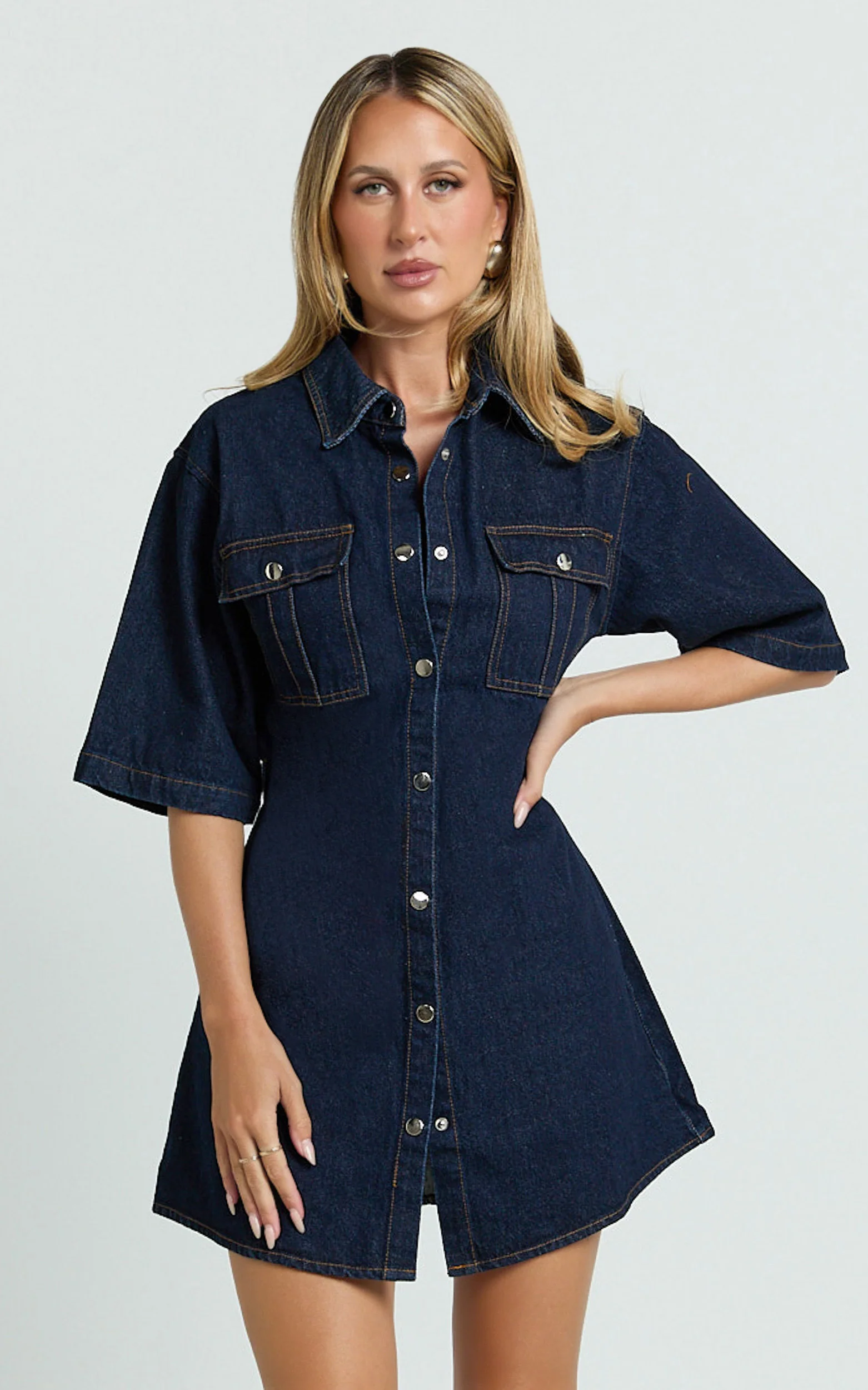 Leilani Mini Dress - Denim Short Sleeve Button Up Dress with Gold Hardware in Indigo Denim
