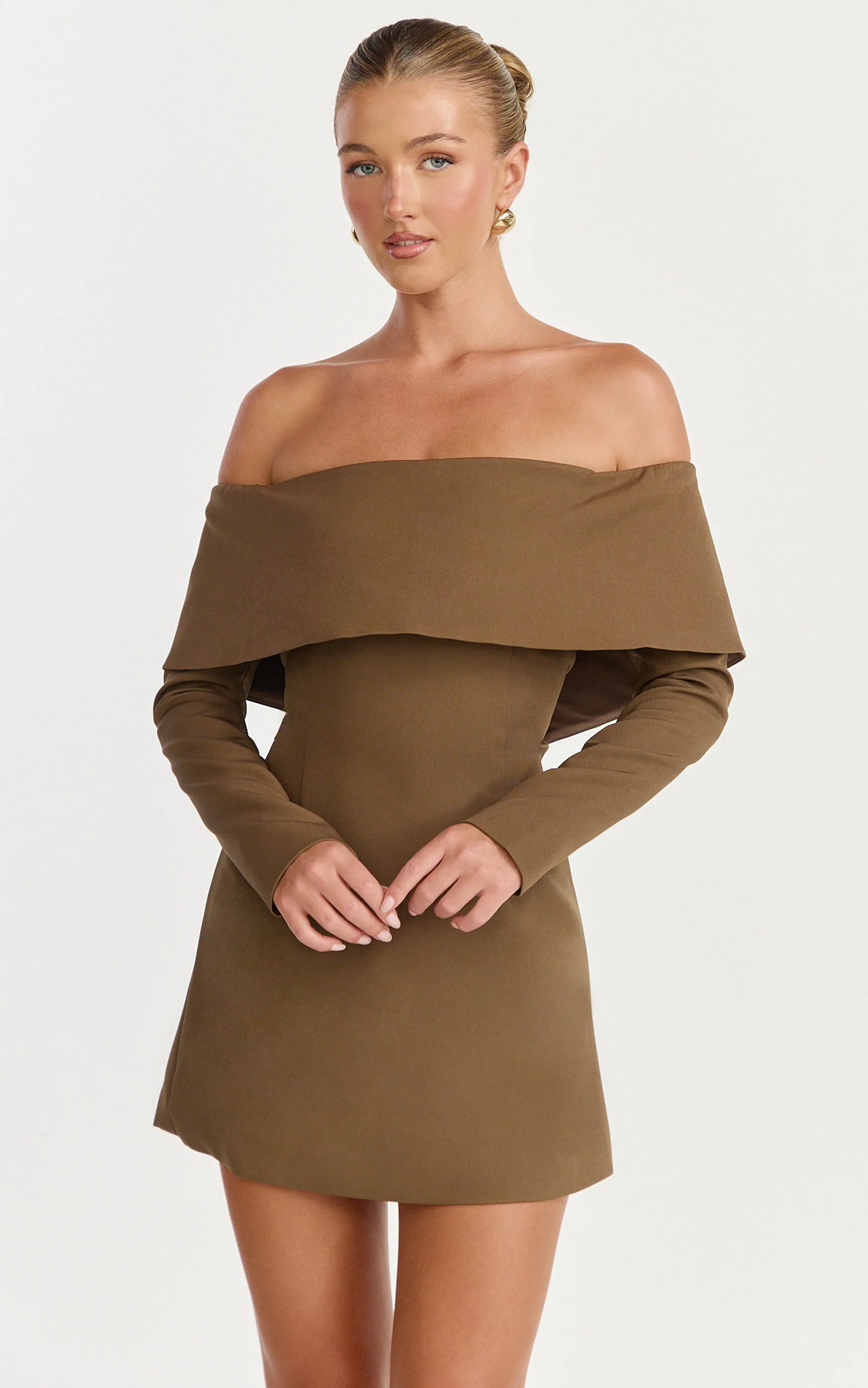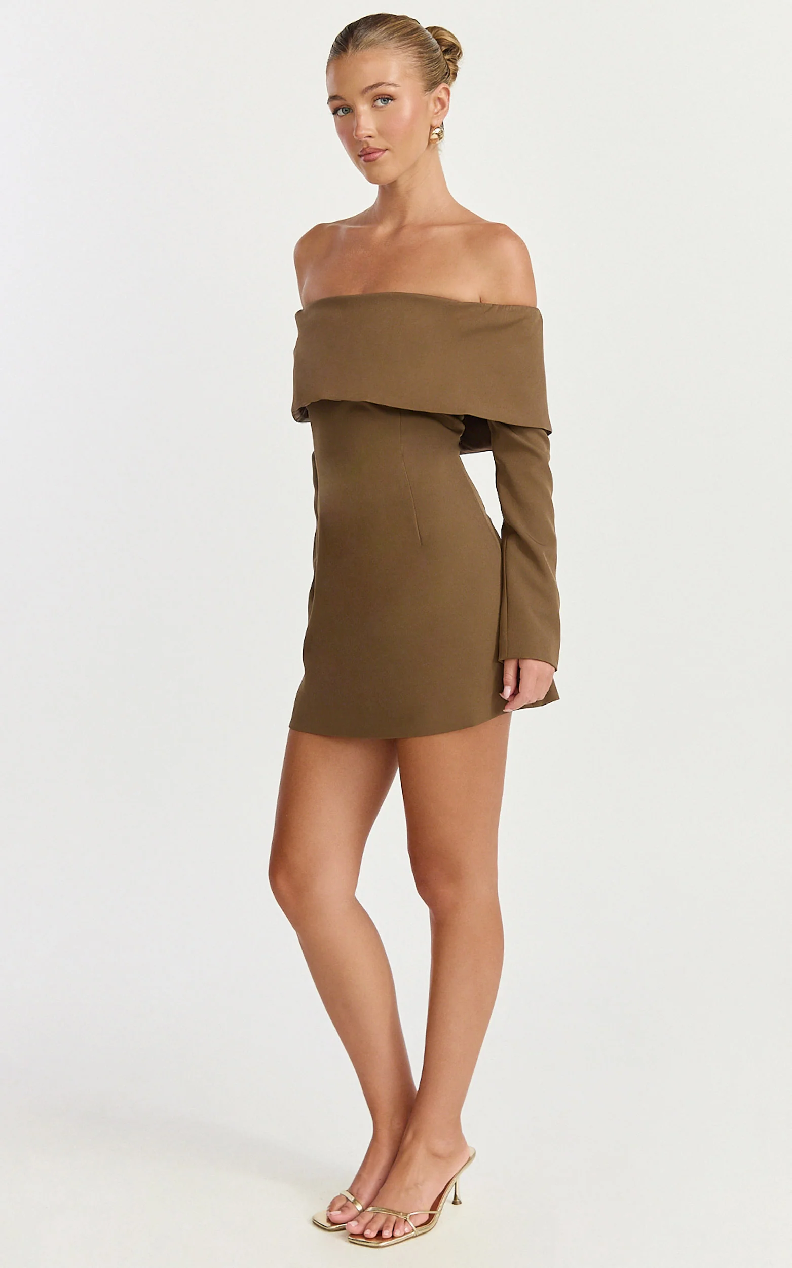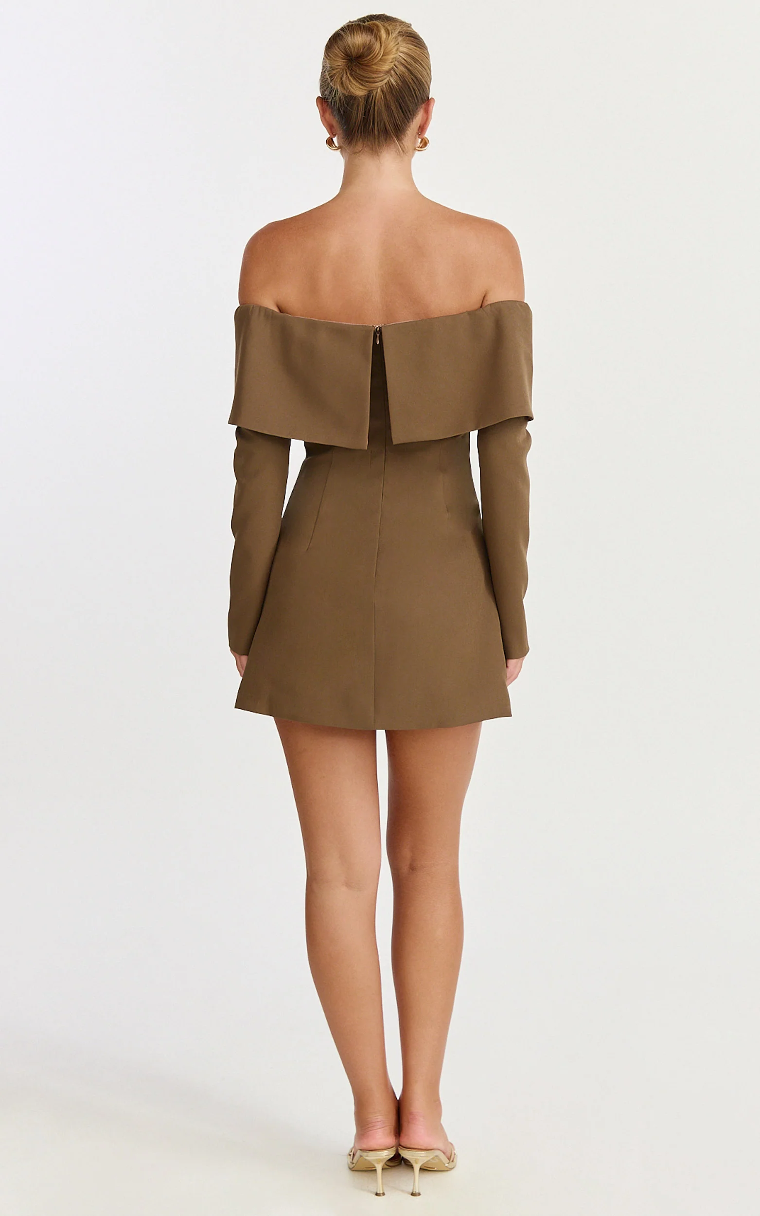 Marigold Mini Dress - Off Shoulder Long Sleeve Dress in Mocha