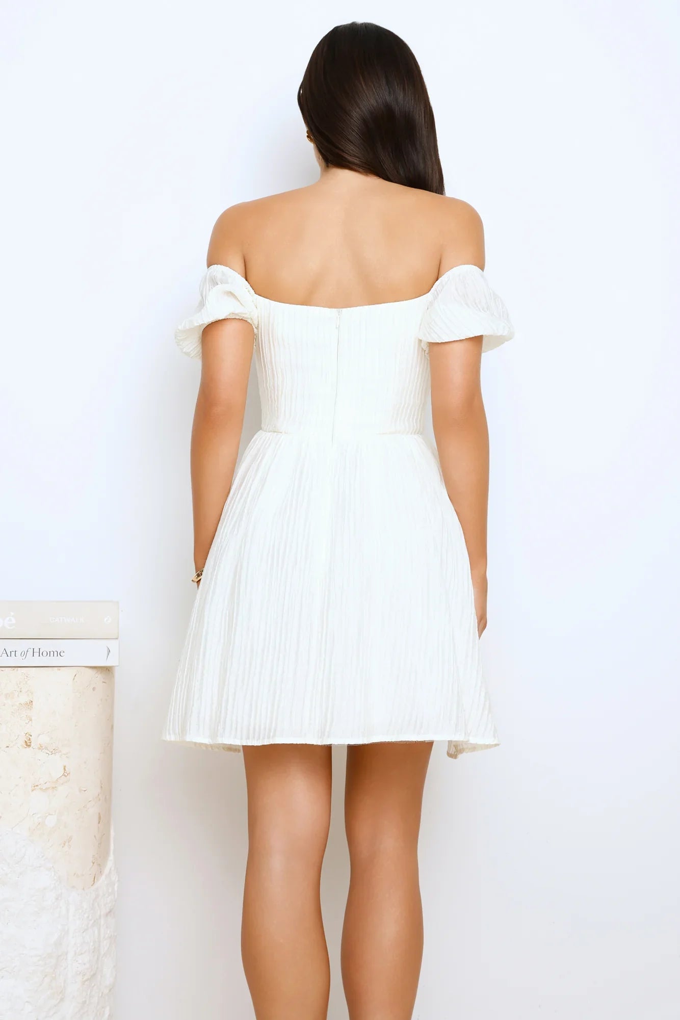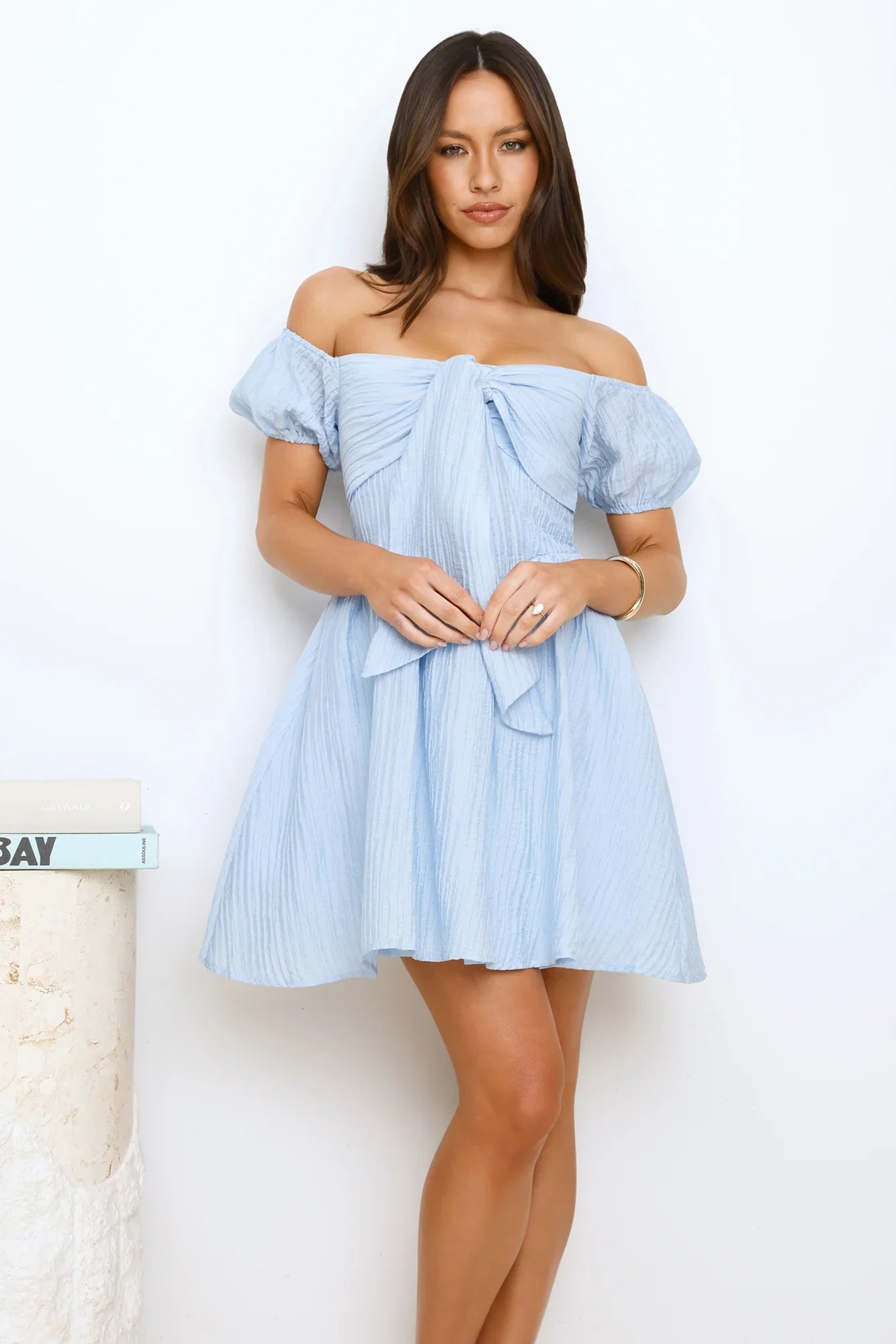 Delight in the dreamy details of the Rosebud Radiance Off Shoulder Mini Dress. With elastic off-the-shoulder sleeves, a textured fabric, a sweet tie neckline, and a flowy skirt with a tulle underlayer, this dress is all about flirty volume and feminine elegance.