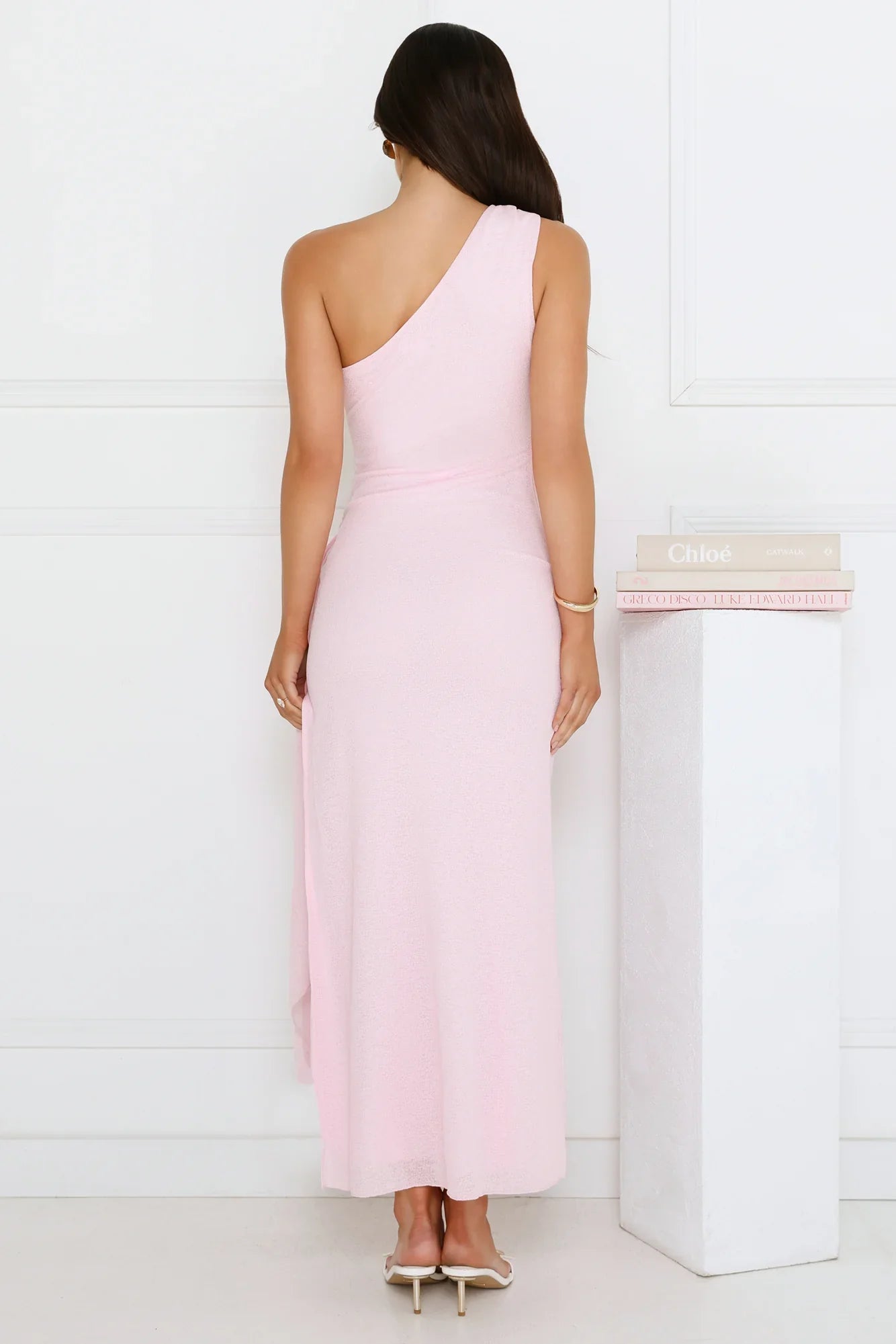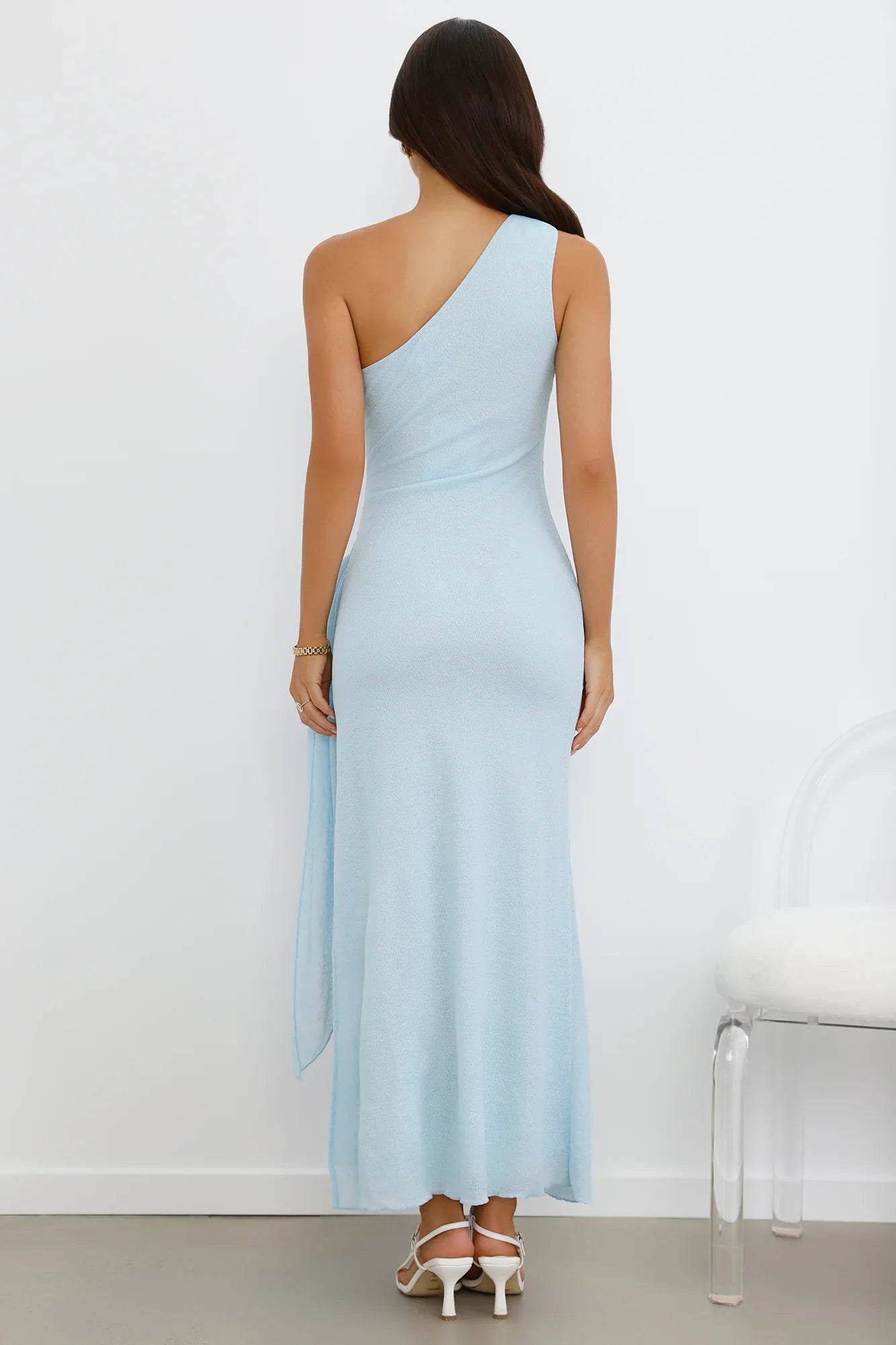 The Tidal Dream One Shoulder Maxi Dress is a stunning combination of stretch fabric and a textured feel, featuring a flattering one-shoulder design and wrap detail at the waist. The split to the skirt adds a sultry touch to this chic look. Pair with metallic sandals and minimal jewellery for an effortless yet stylish vibe!